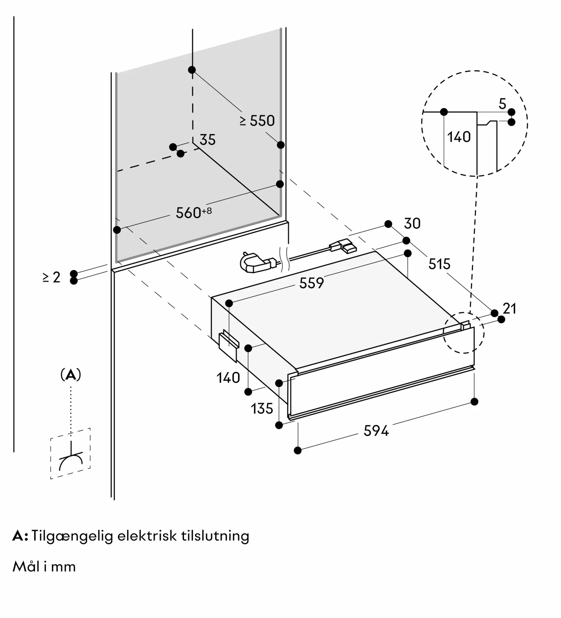 Fremspringet fra apparatets front til møbelskabet er 21 mm.