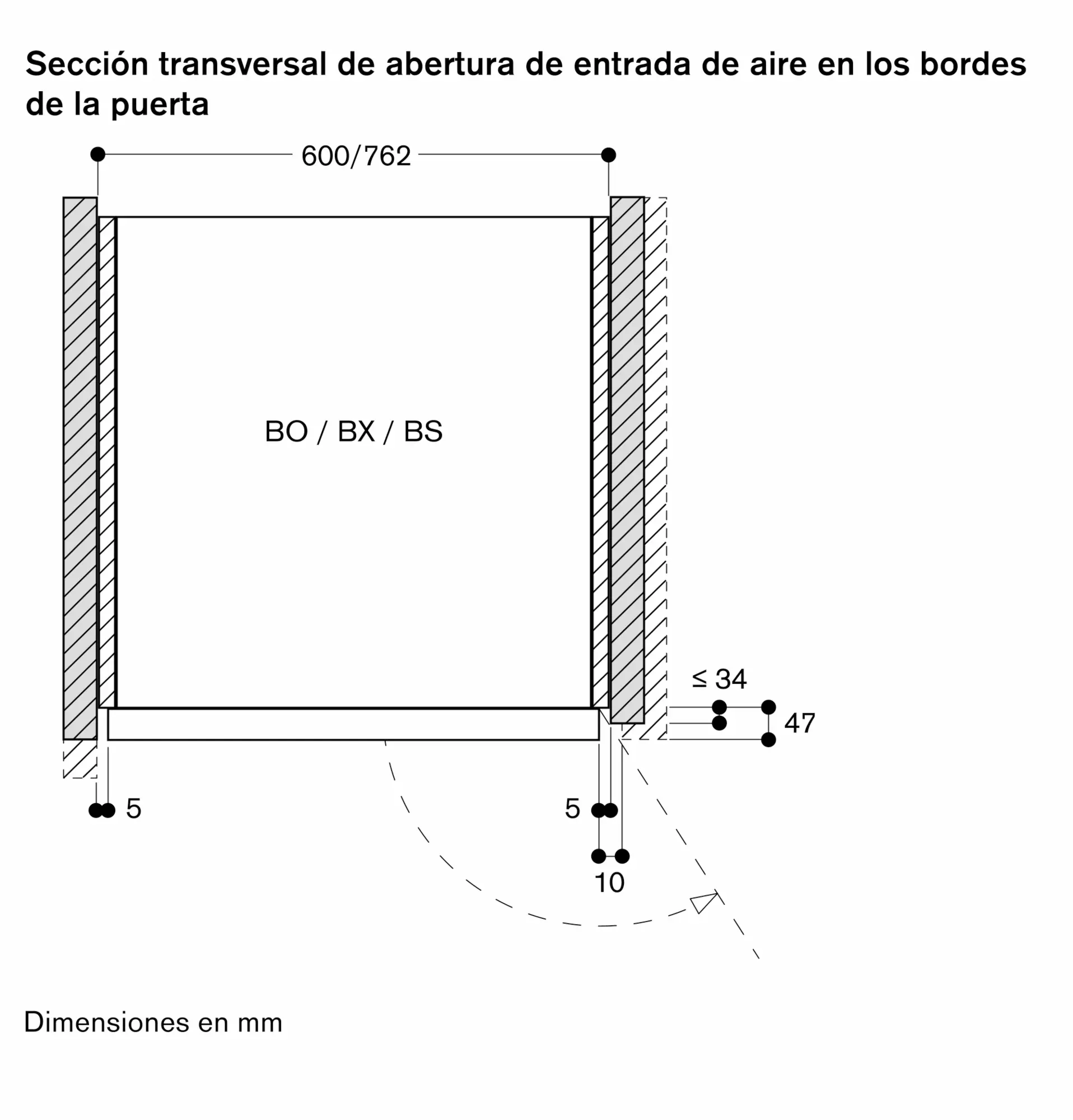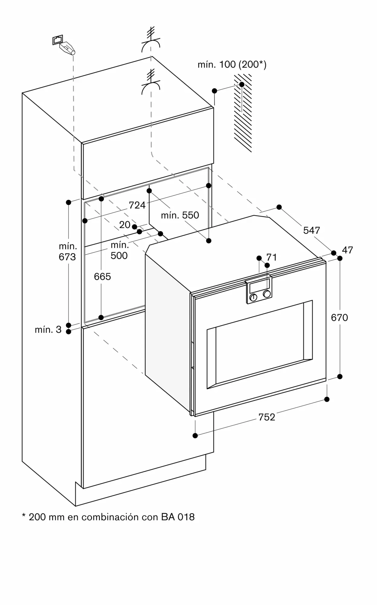 En caso de realizar un diseño con el horno al lado de una pared, considerar los 90º de apertura lateral necesarios para la puerta.