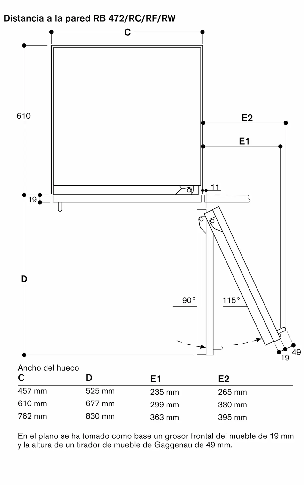 Ángulo de apertura de puerta 115º, se puede fijar a 90º.