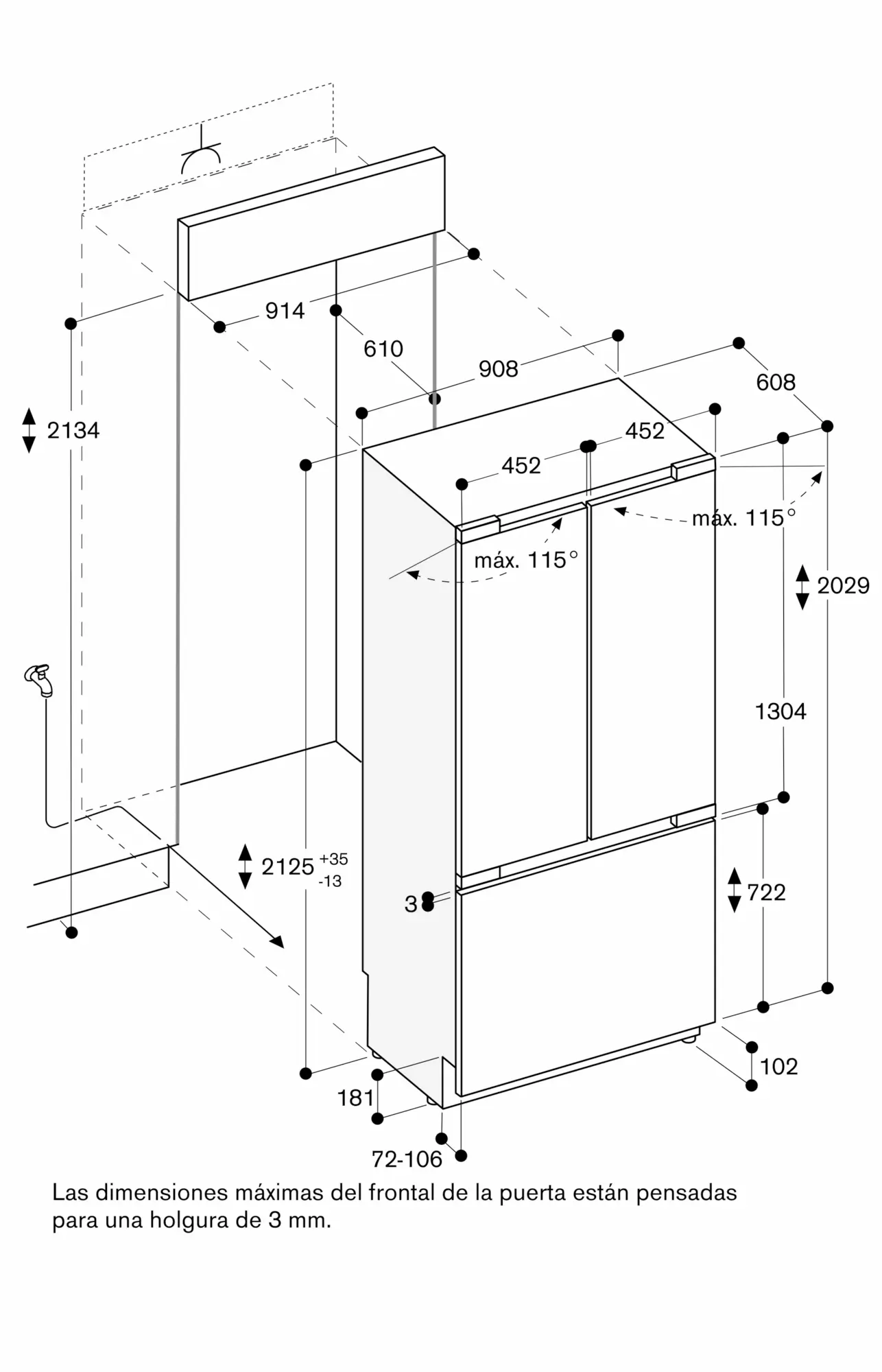 Ángulo de apertura de puerta 115º, se puede fijar a 90º.