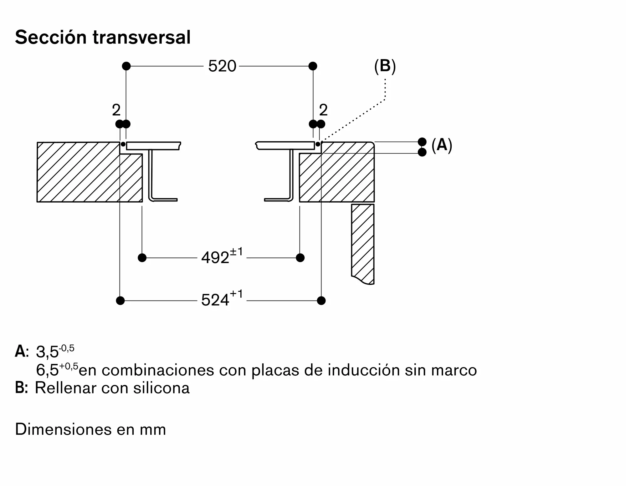 El rebaje de la encimera debe ser continuo y plano, para garantizar la colocación del aparato en la junta. No se recomiendan encimeras discontinuas.