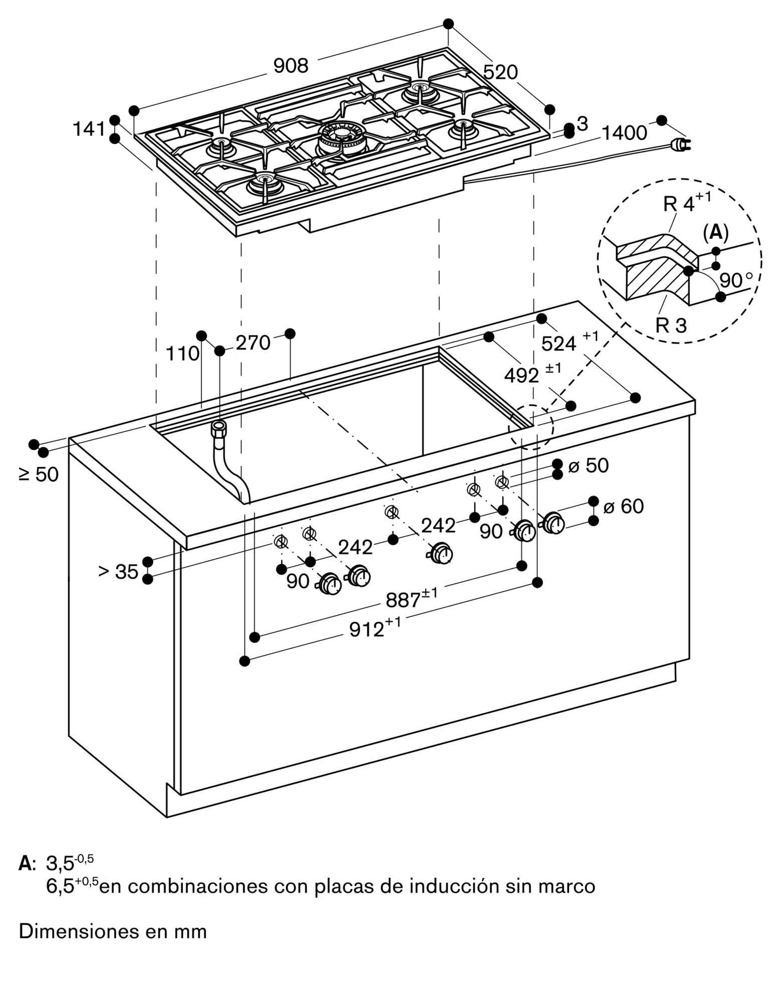 Dependiendo del tipo de instalación (sobre encimera o enrasada, con o sin tapa) la localización específica del hueco de encastre y los mandos puede variar.