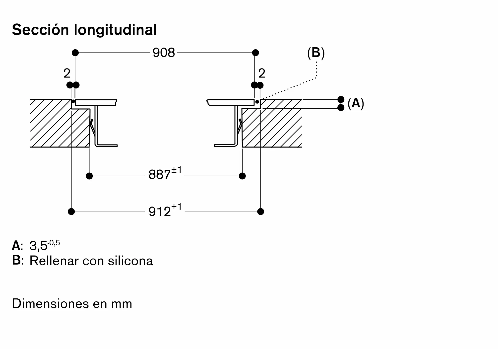 El rebaje de la encimera debe ser continuo y plano, para garantizar la colocación del aparato en la junta. No se recomiendan encimeras discontinuas.
