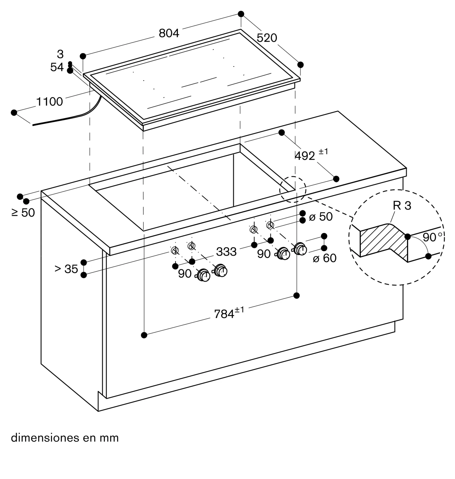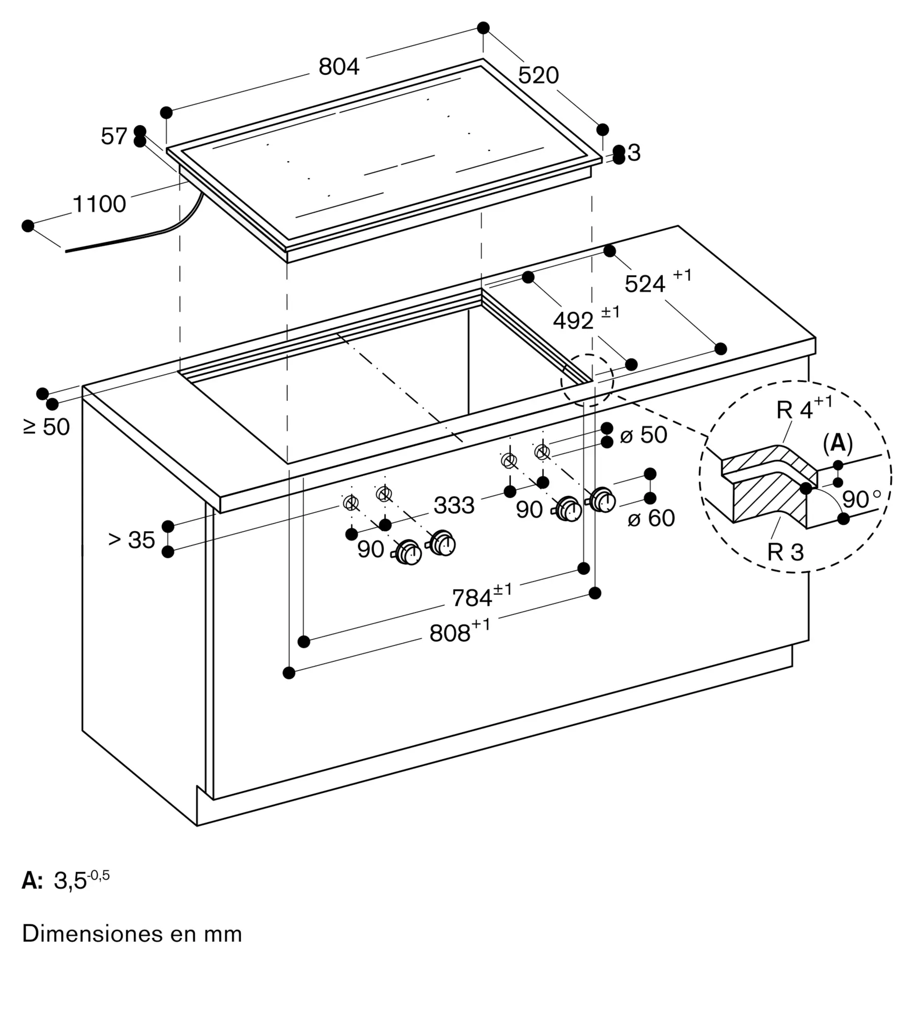 Dependiendo del tipo de instalación (sobre encimera o enrasada) el hueco de encastre y los mandos puede variar.