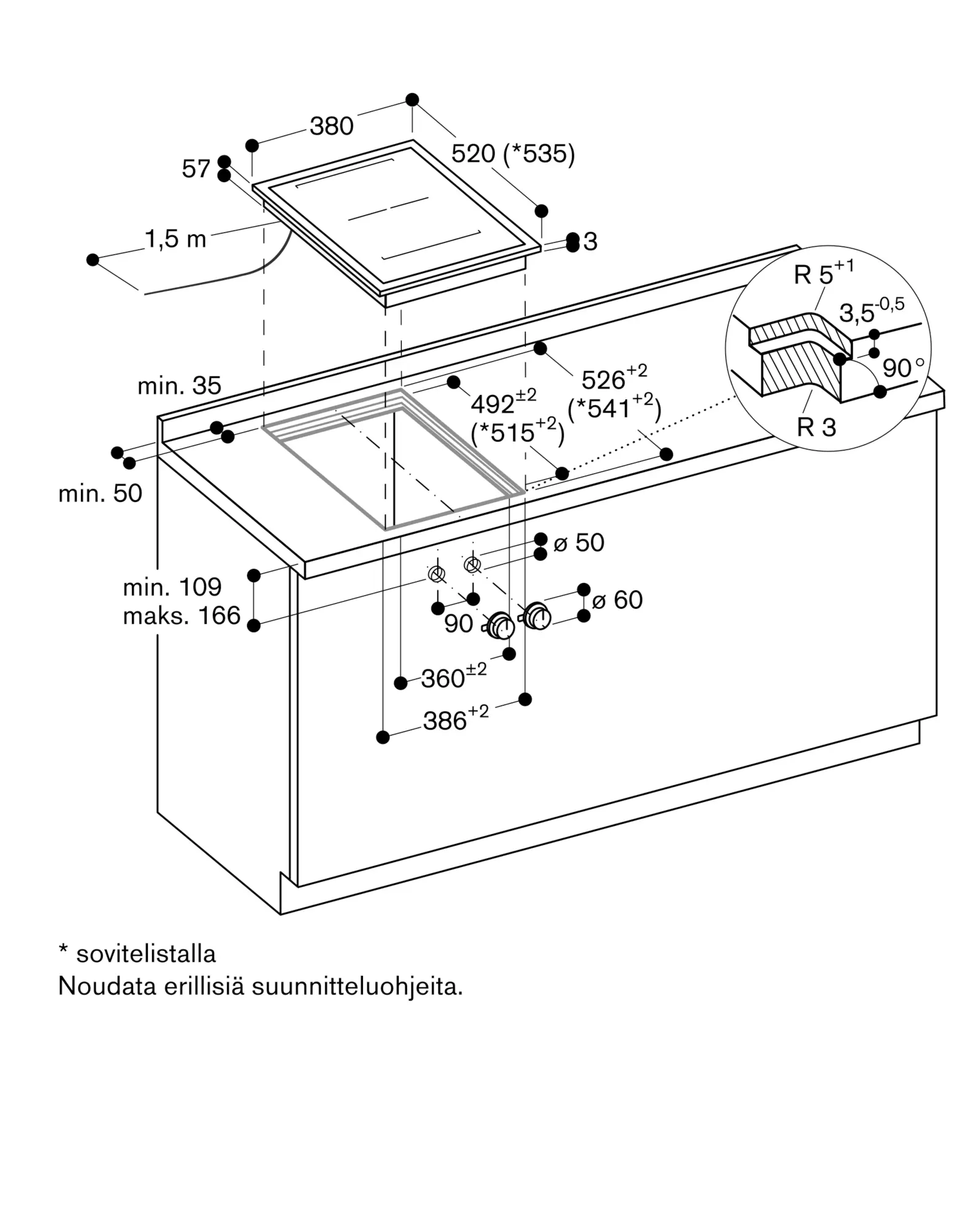 Asennusleveys vaihtelee jonkin verran yhdistelmän kokotoleranssin ja työtason aukon mukaan