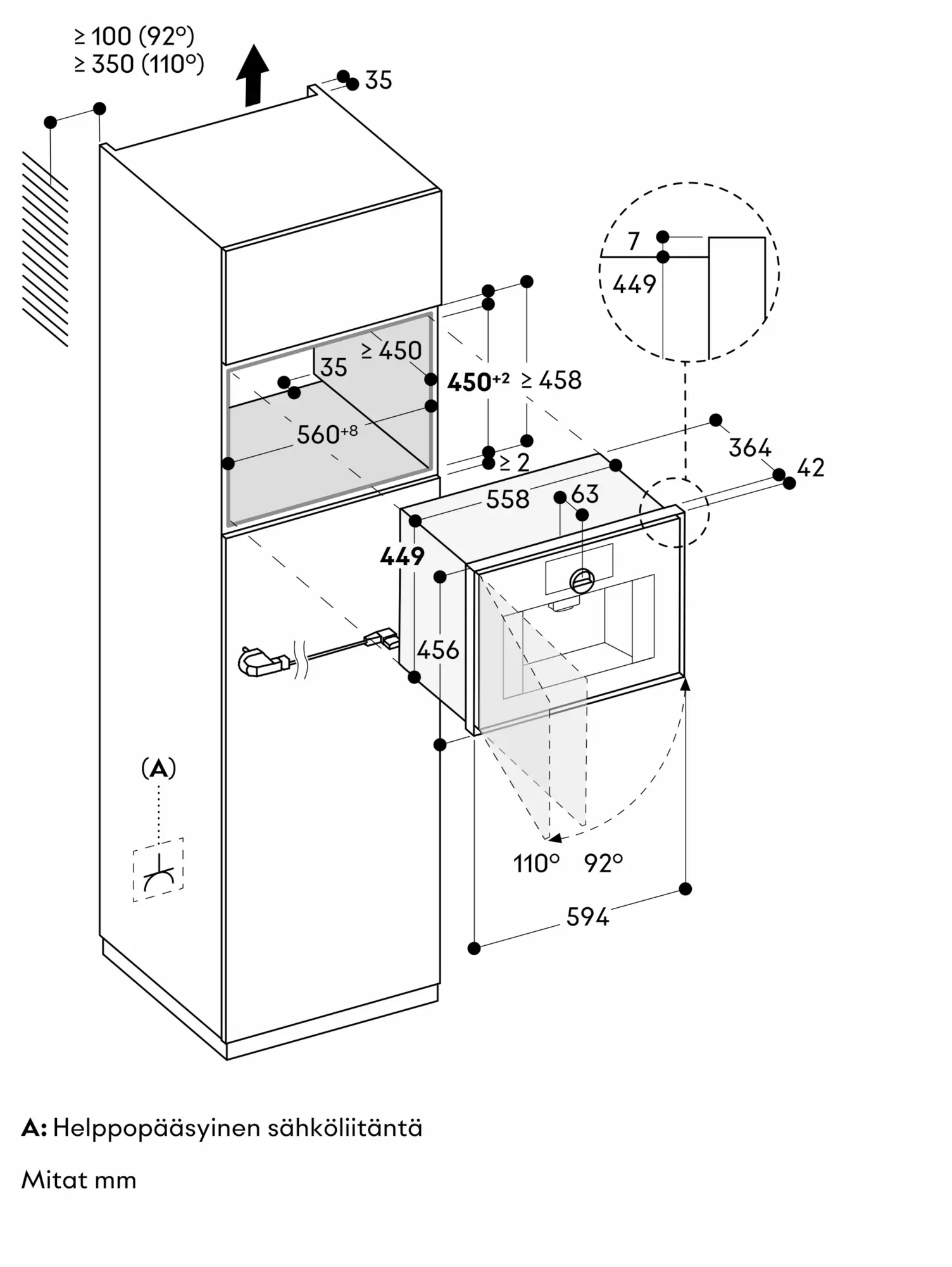 Oven avautumiskulma noin 110° (toimituksen yhteydessä). Asennusväli seinään vähintään 350 mm