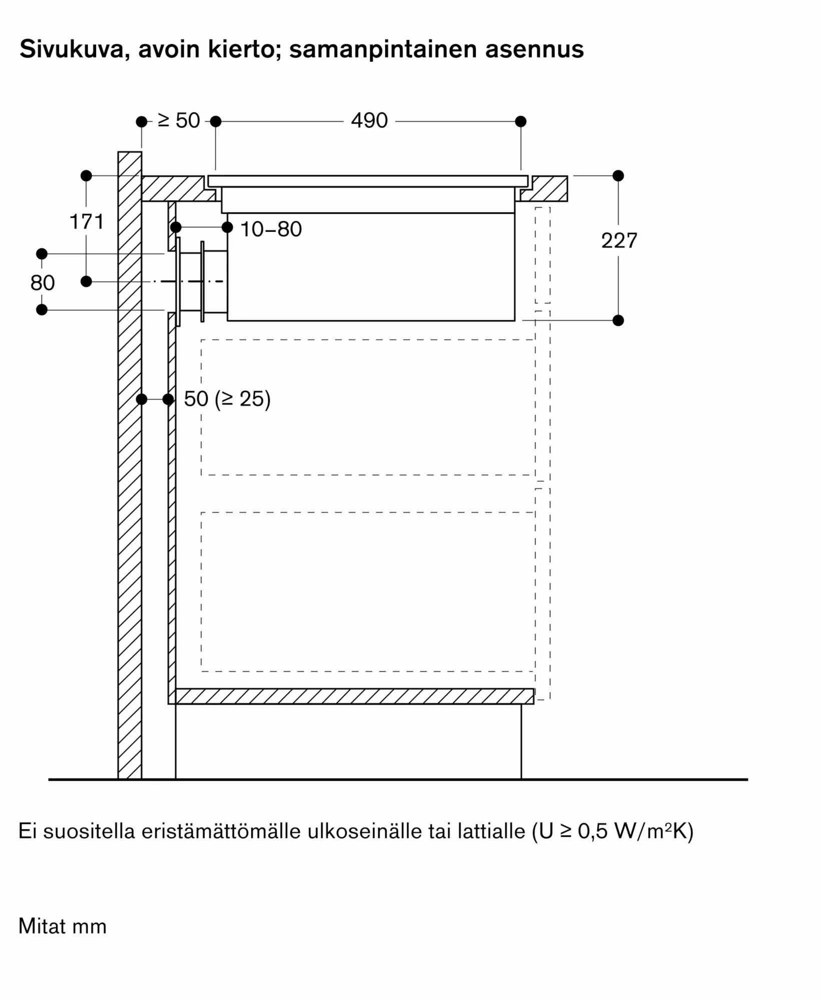 Avoimen ilmankierrätyksen sarja CA 082 011 edellyttää, että kalusteiden takapaneelin takana on vähintään 25 mm:n pystysuuntainen aukko. Paras tehokkuus saadaan, jos mitta on 50 mm