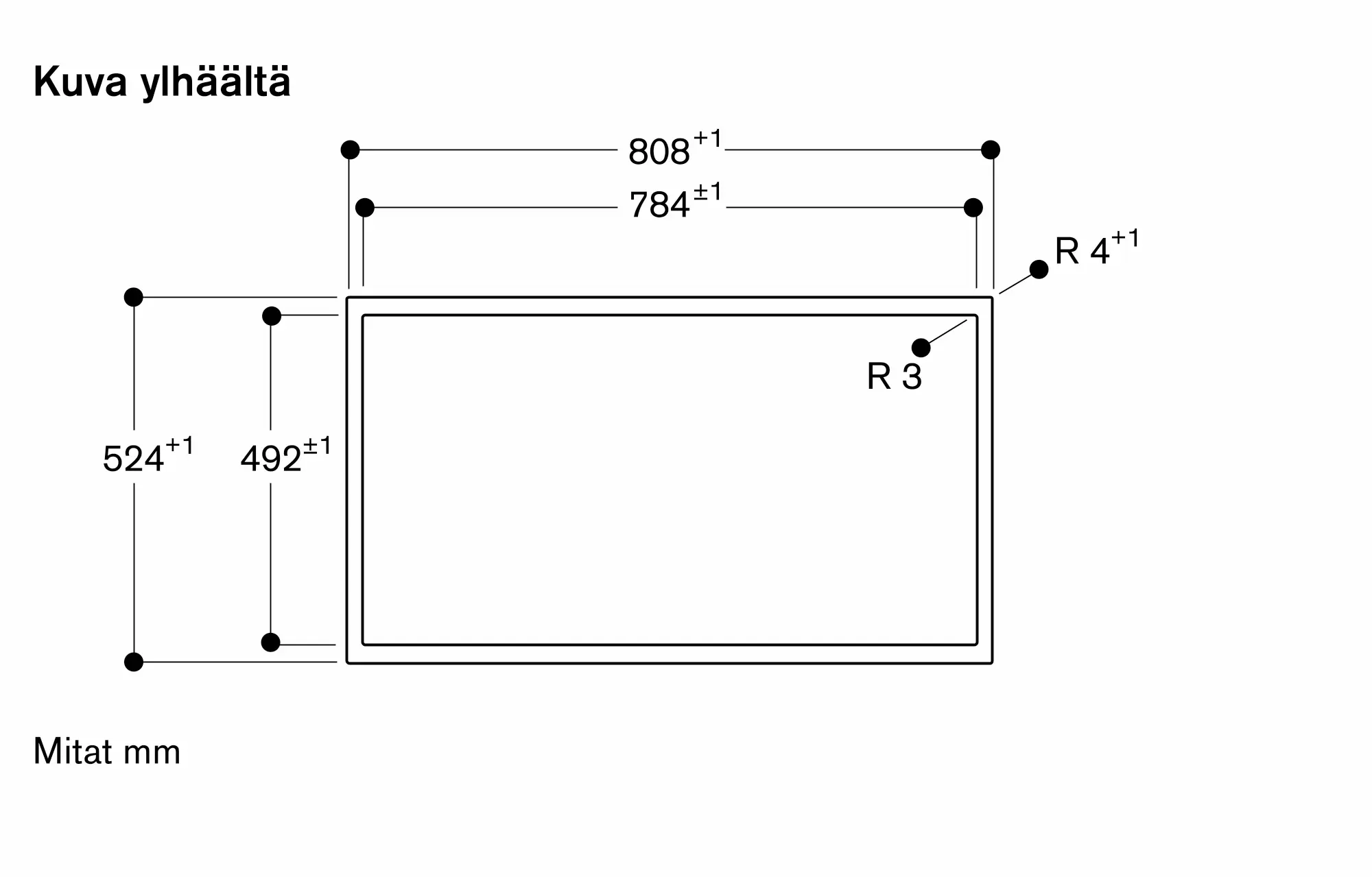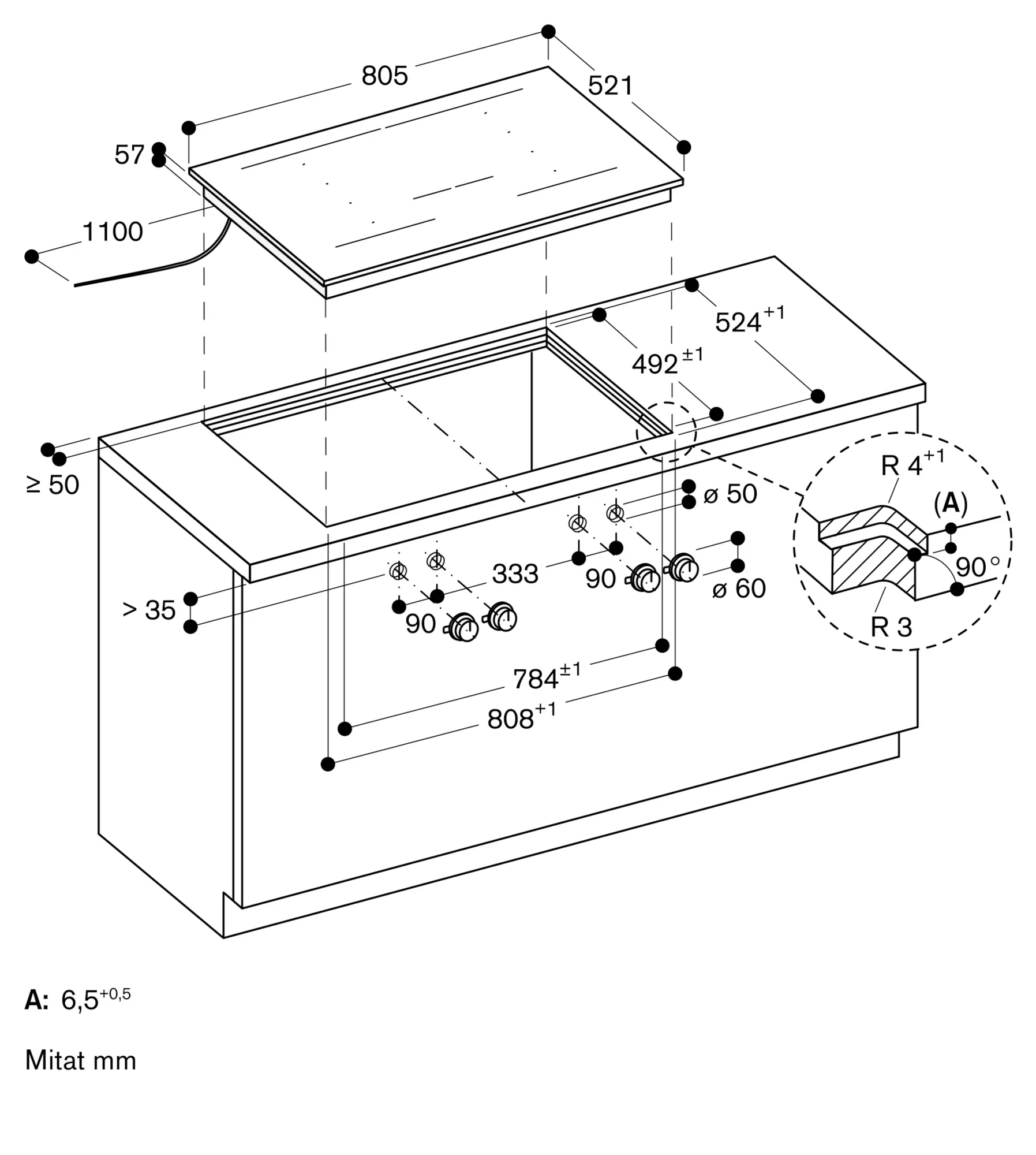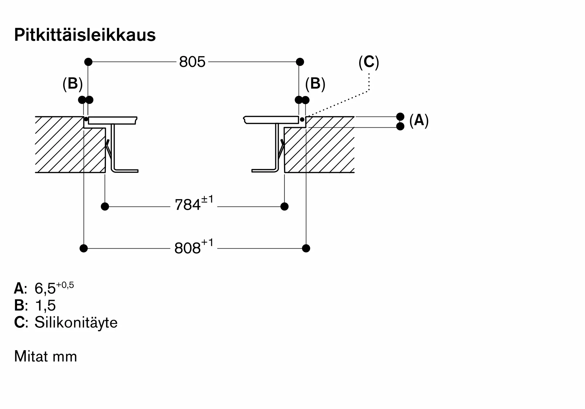 Asennusleveys vaihtelee jonkin verran yhdistelmän kokotoleranssin ja työtason aukon mukaan