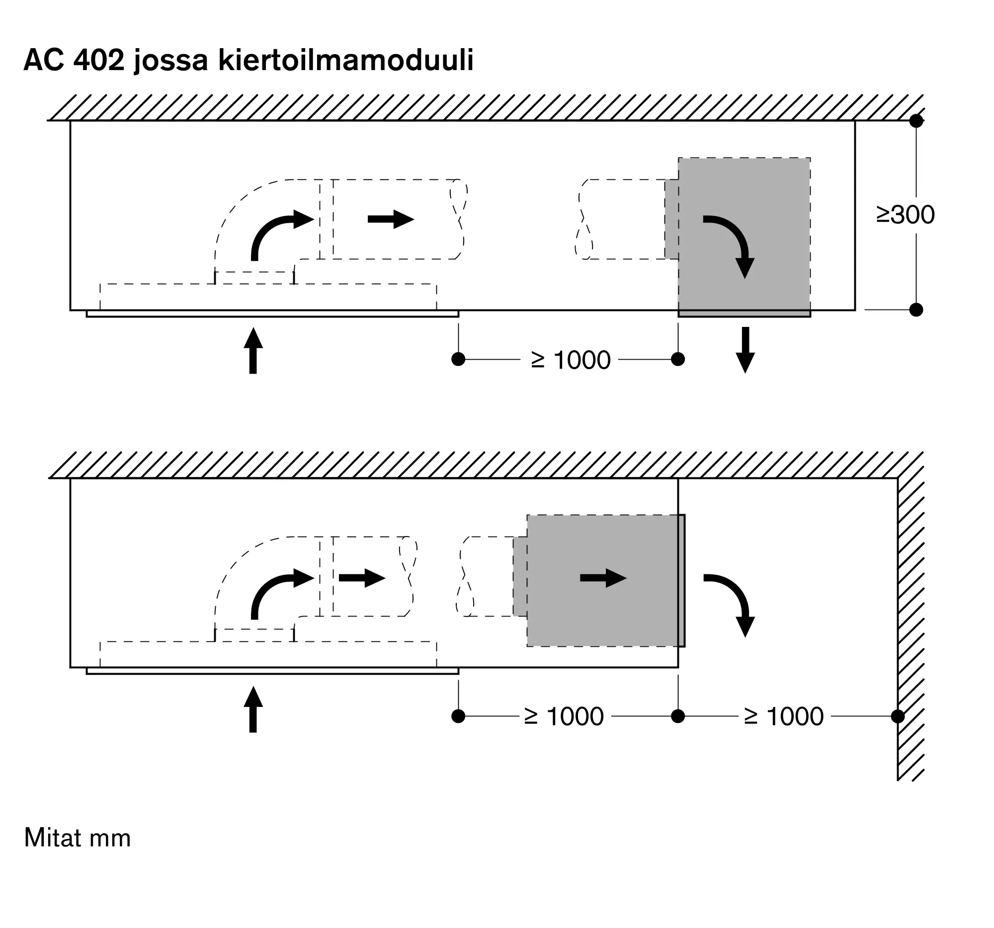 Optimaalisen poistotehon saavuttamiseksi keittotason ja ilmanvaihtolaitteen välinen enimmäisetäisyys on 120 cm.