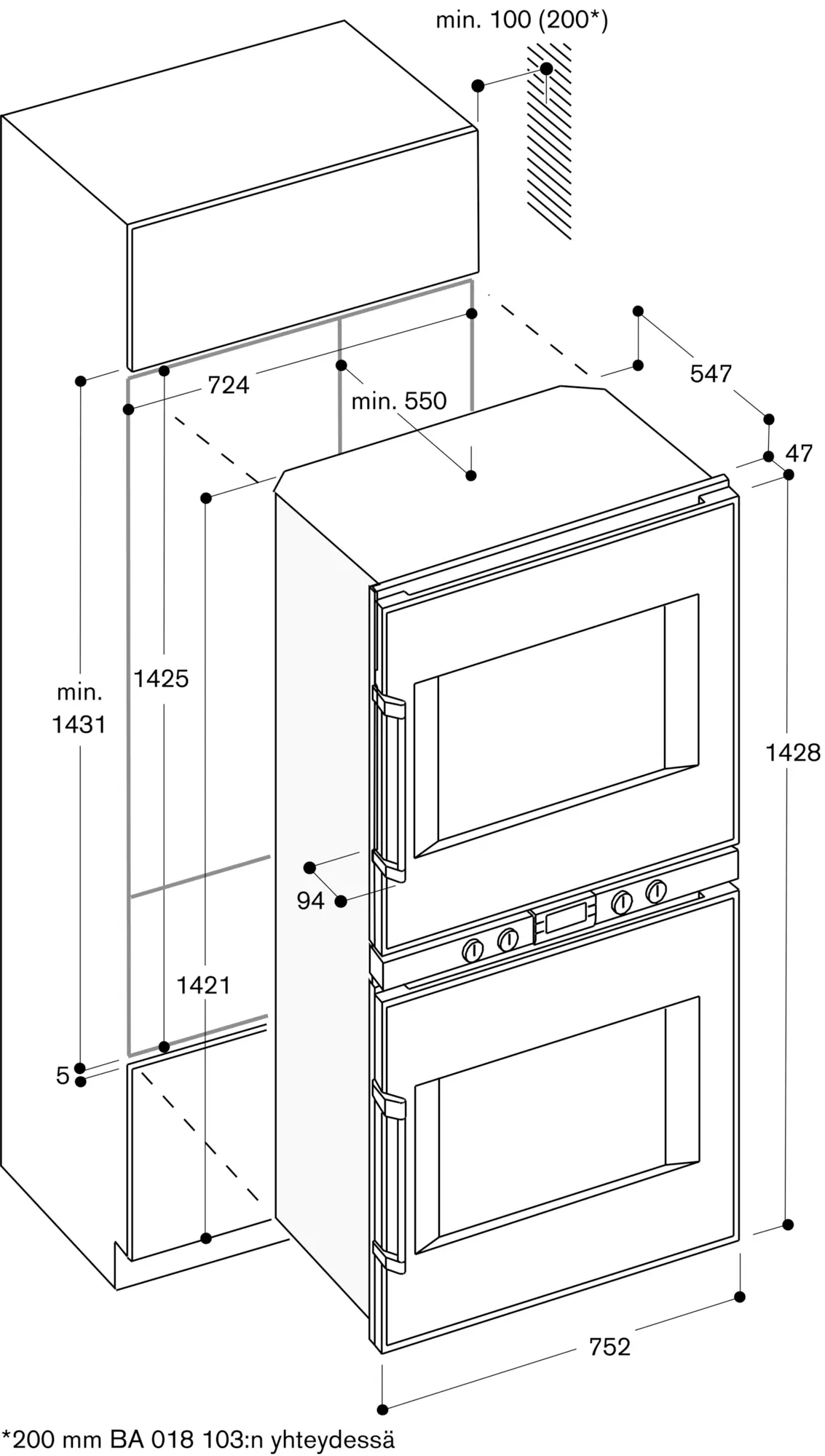 Laitteen etureuna tulee 47 mm ulos kaapiston rungosta