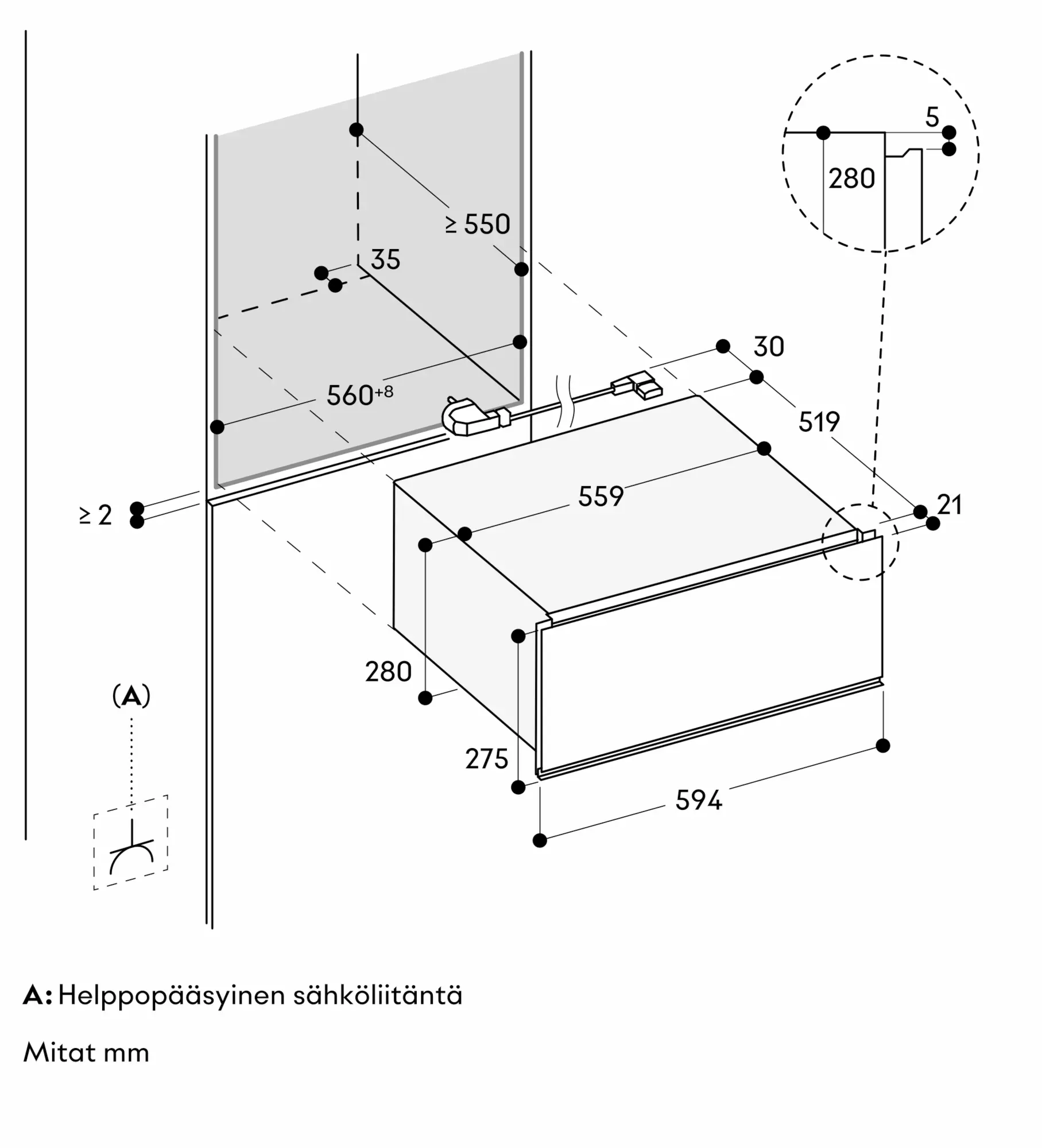 Laitteen etuosan ulkonema kalustekaapista 21 mm