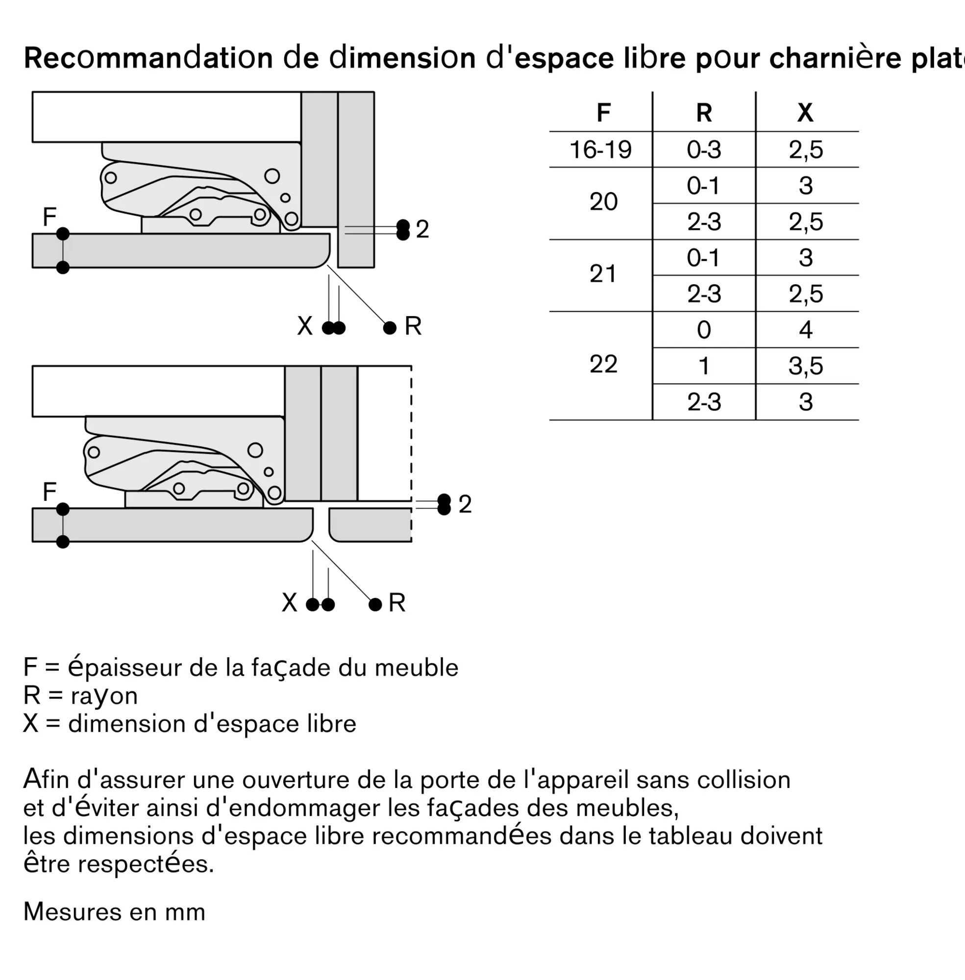 Angle d'ouverture de porte 115°, peut être bloqué à 90°.