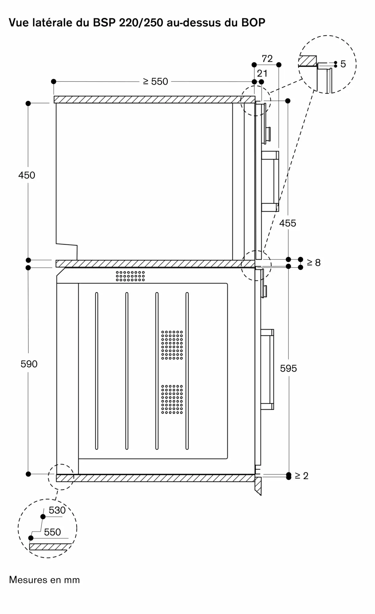 Distance entre le corps meuble et la vitre avant de l'appareil : 21 mm.
