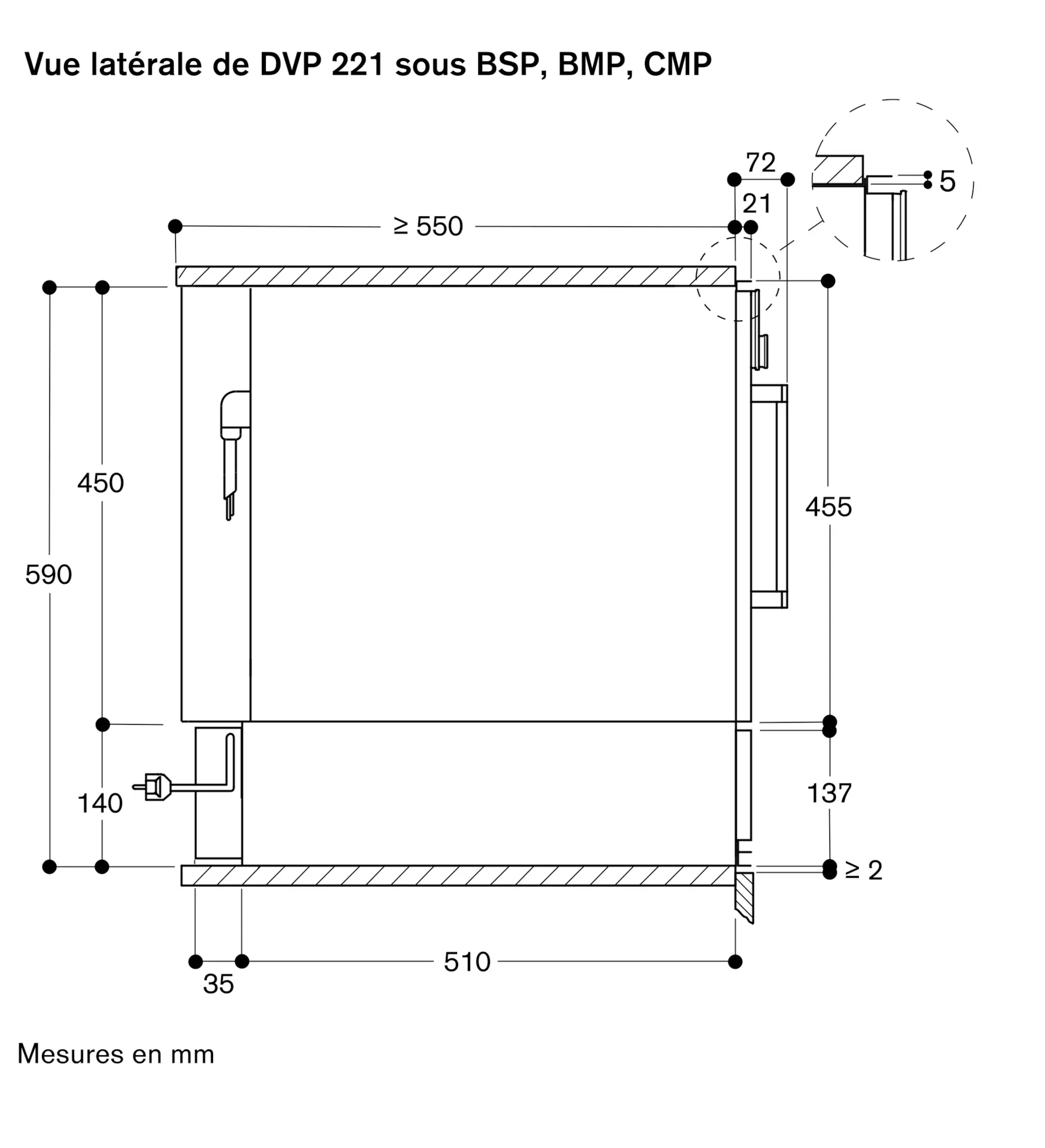Espace latéral nécessaire de mini. 5 mm entre façade de l'appareil et panneau d'habillage du meuble.