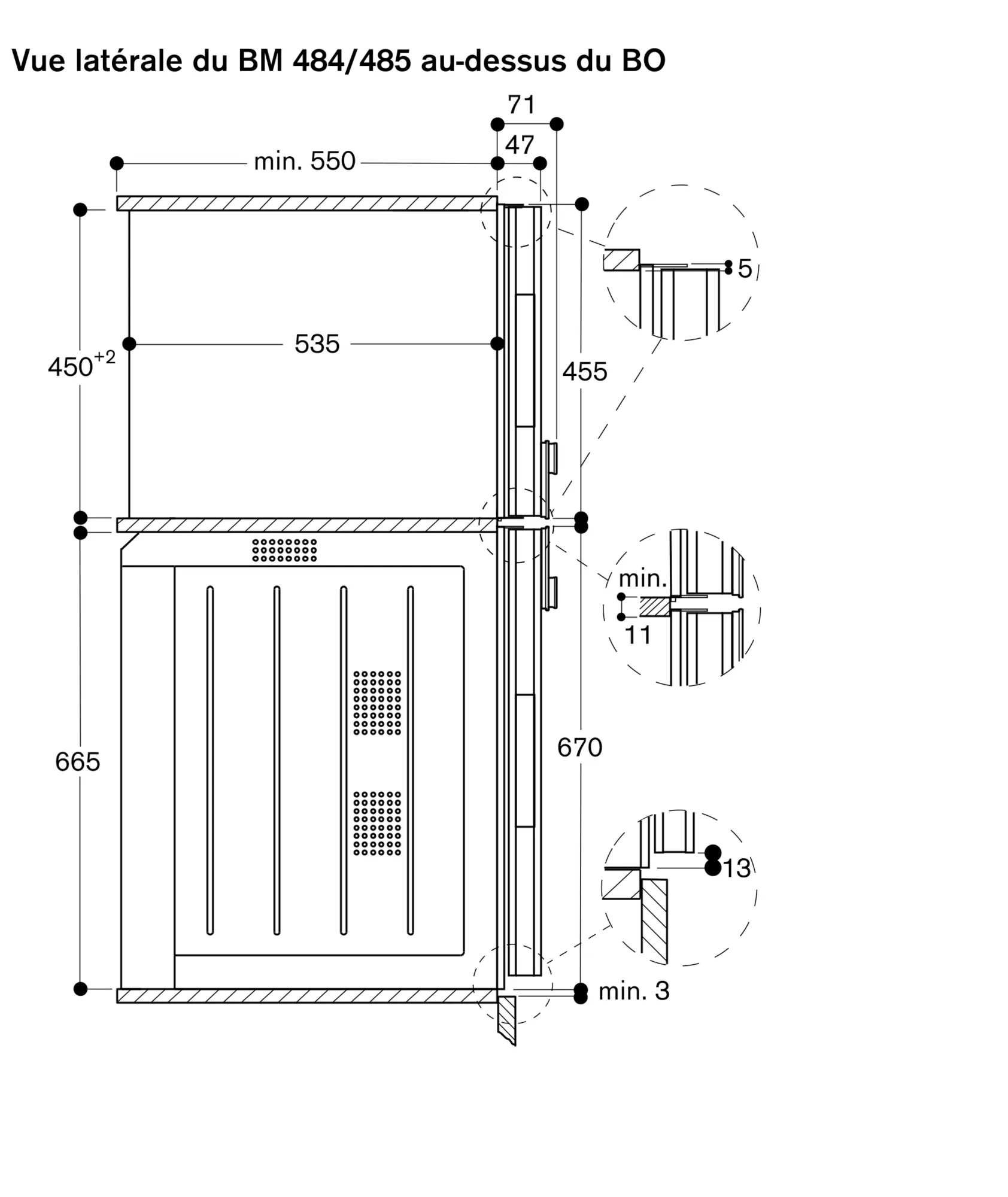 Distance entre le corps du meuble et la vitre avant du four : 47 mm.