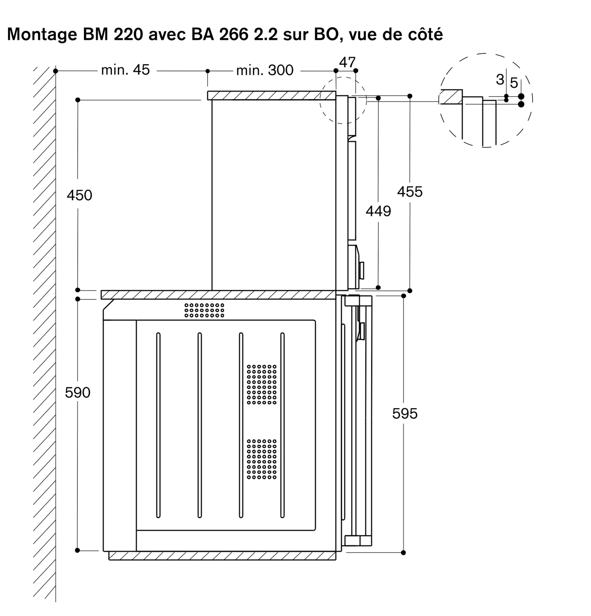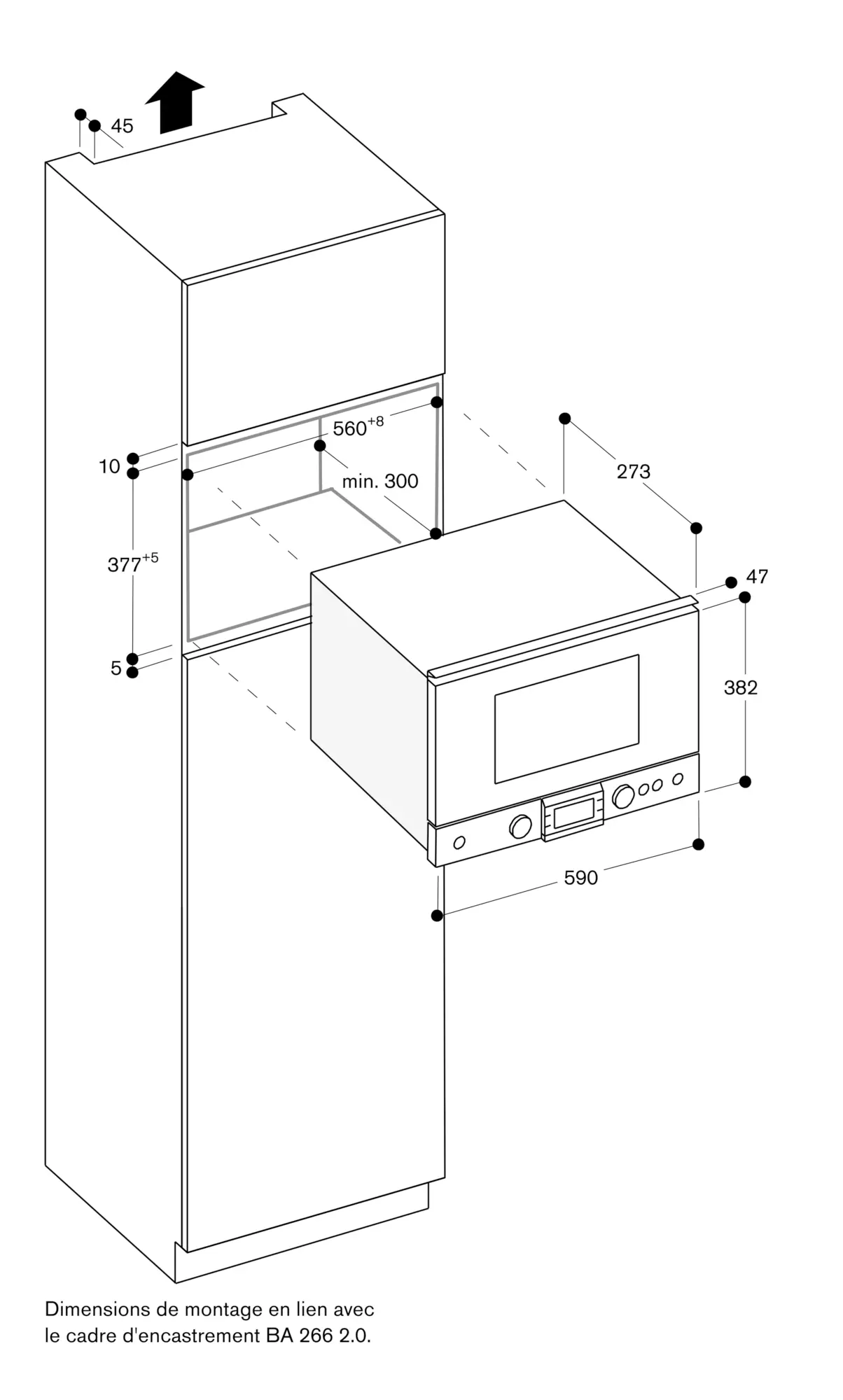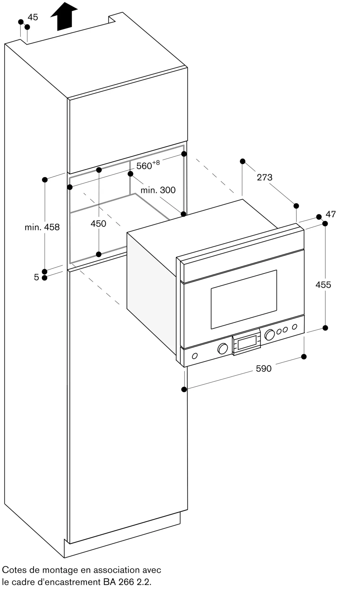 Lors d'une installation avec le cadre d'encastrement BA 266 2., la façade de l'appareil dépasse de 47 mm celle du meuble.