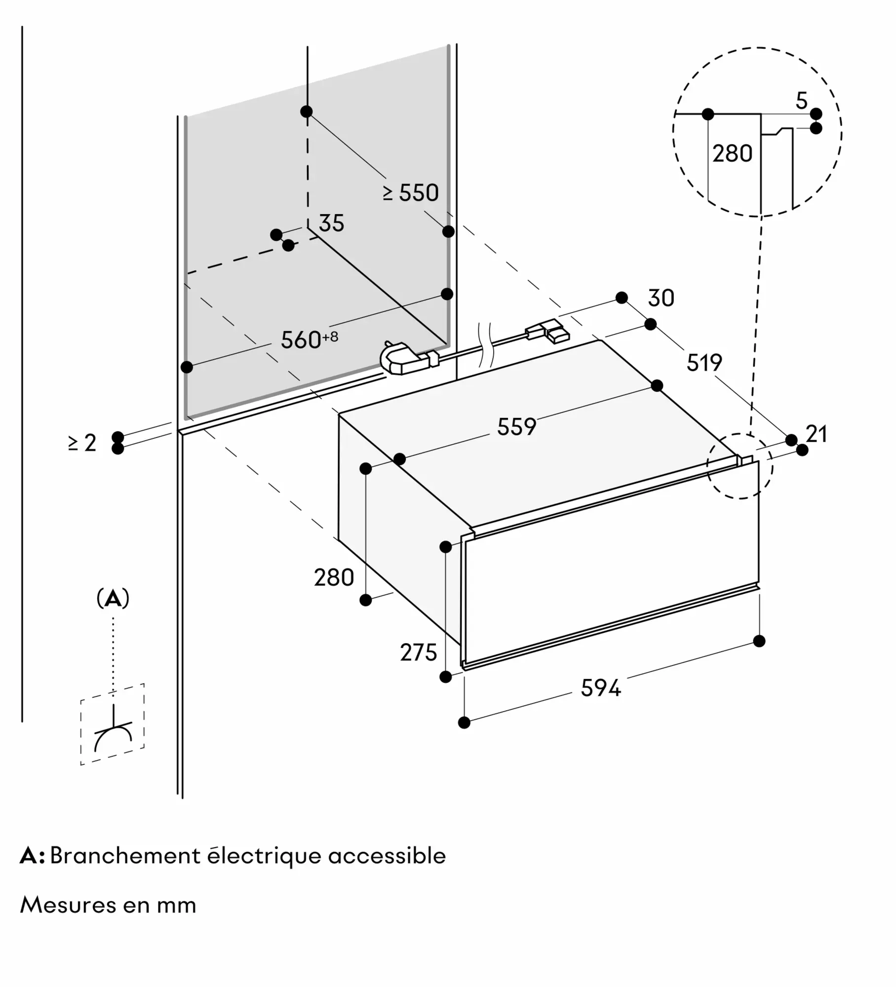 Dépassement de la façade de l'appareil par rapport au corps du meuble : 21 mm.