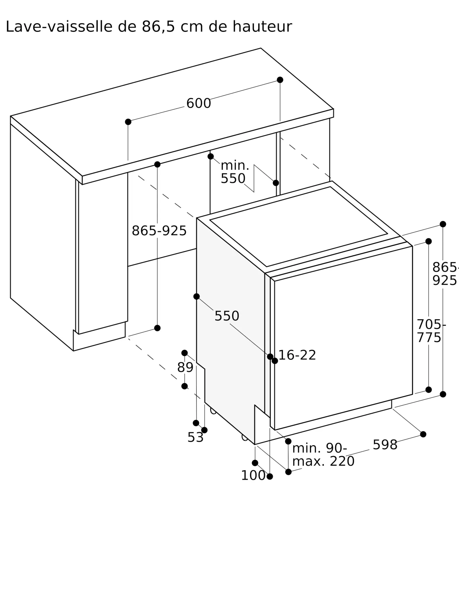 Taille maximale des assiettes (panier supérieur/inférieur) pour lave-vaisselle hauteur 86,5 cm: 29/28, 26.5/30.5 ou 24/34 cm.