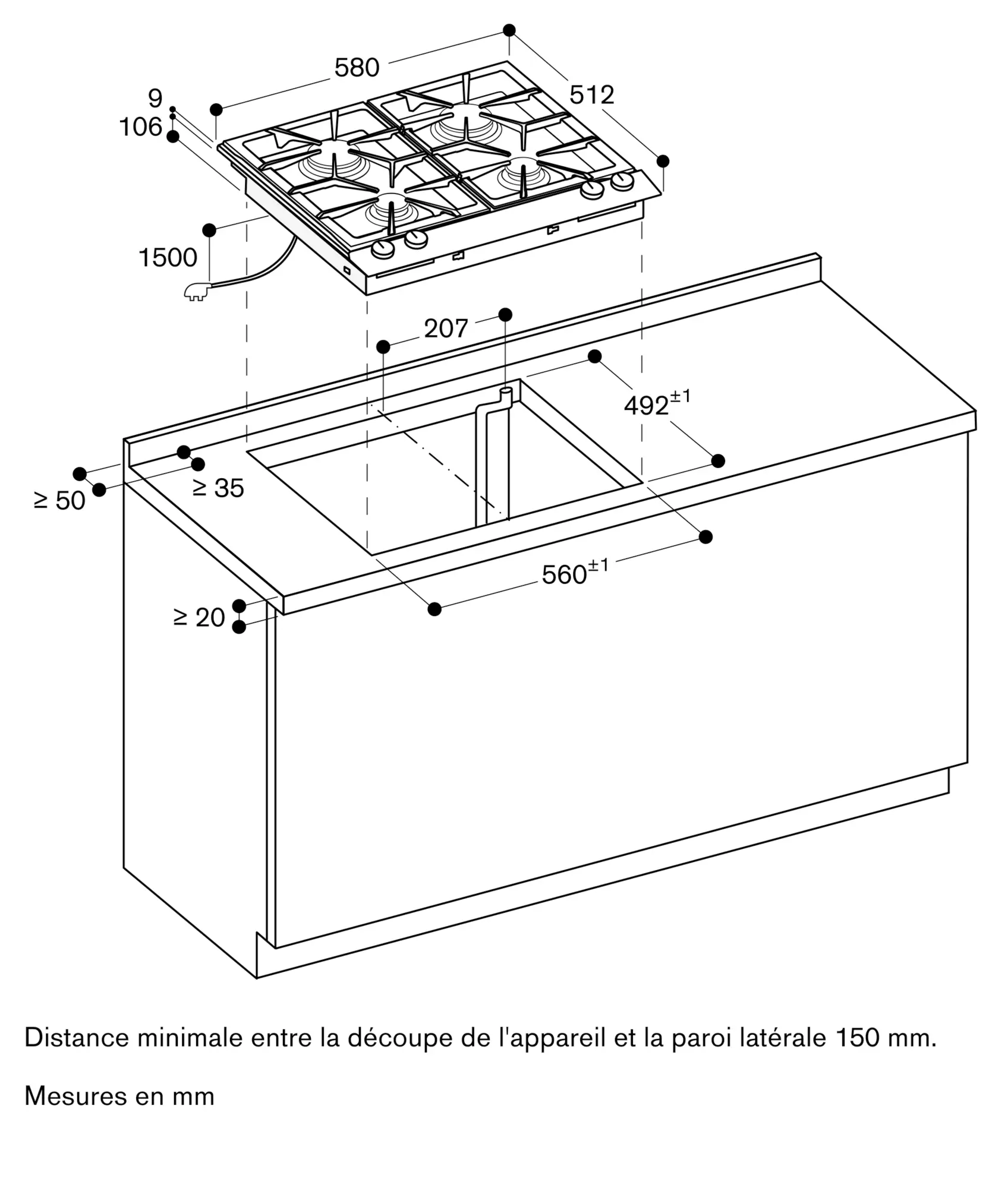 Distance latérale minimale de 150 mm avec les meubles latéraux pour protection contre chauffe, ou prévoir une isolation supplémentaire.