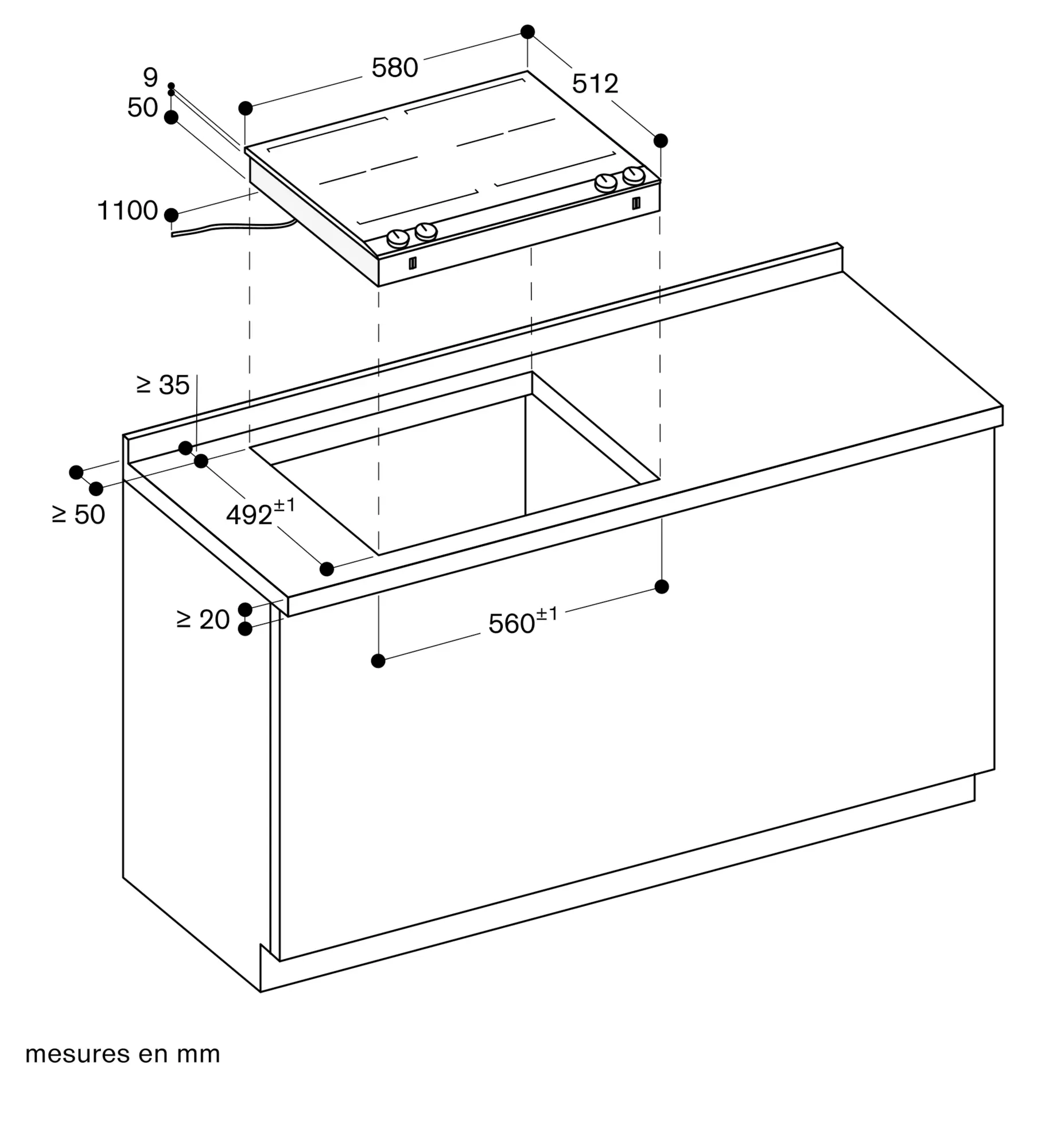 L'appareil s'intègre dans le plan de travail par le dessus.