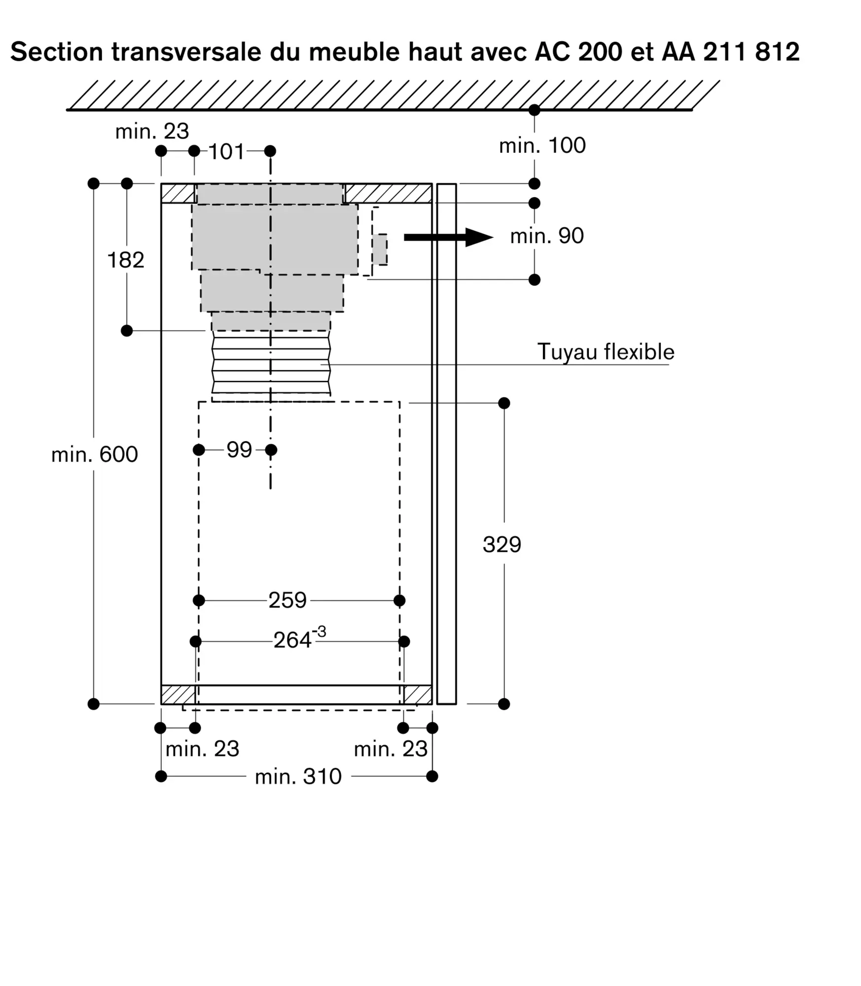 Distance minimale au-dessus d'une table gaz : 65 cm (minimum 70 cm si puissance totale du gaz supérieure à 12 kW).