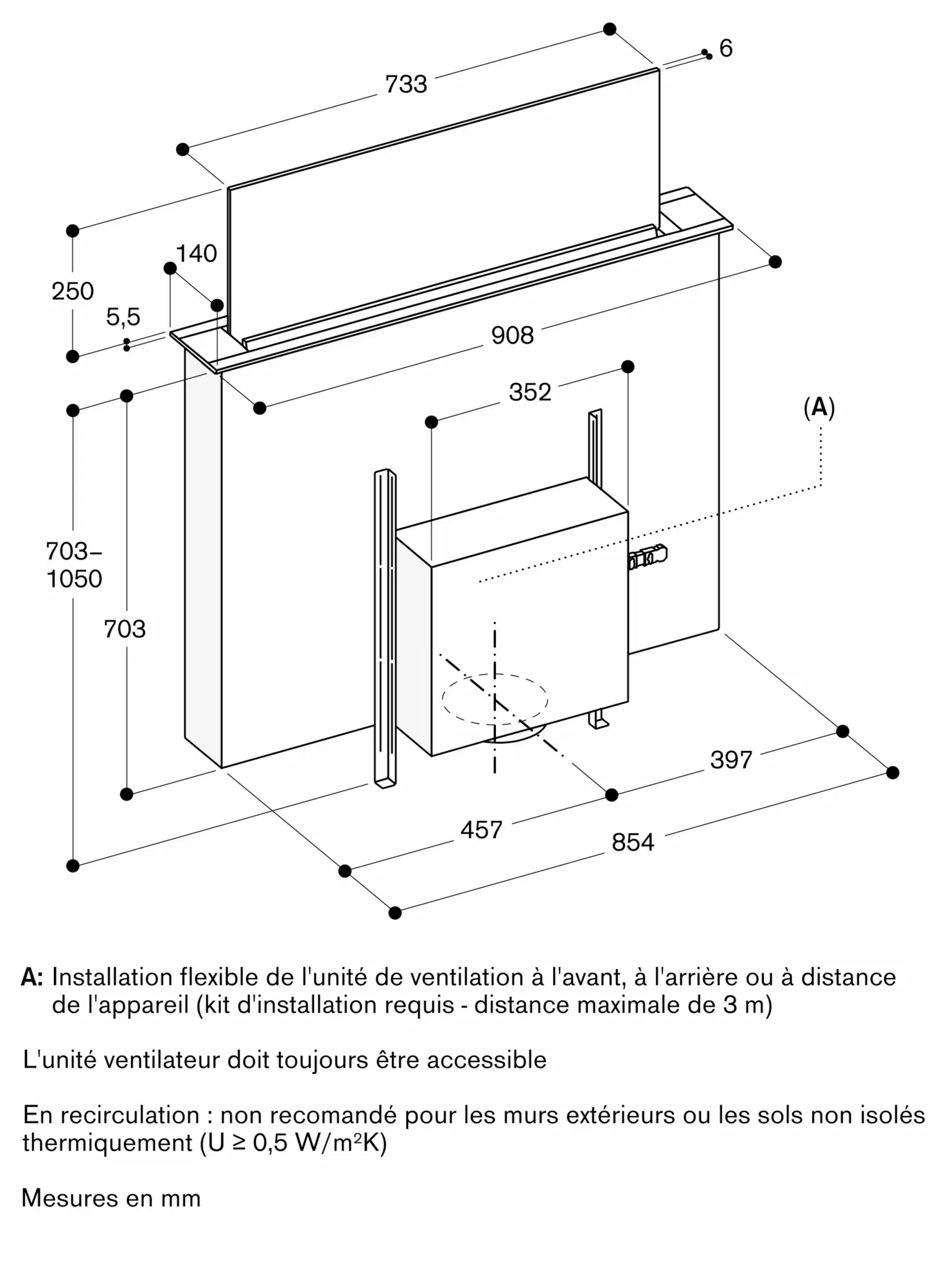 Pour une performance optimale en mode recyclage, nous recommandons une surface d'au moins 400 cm² pour la circulation de l'air recyclé.