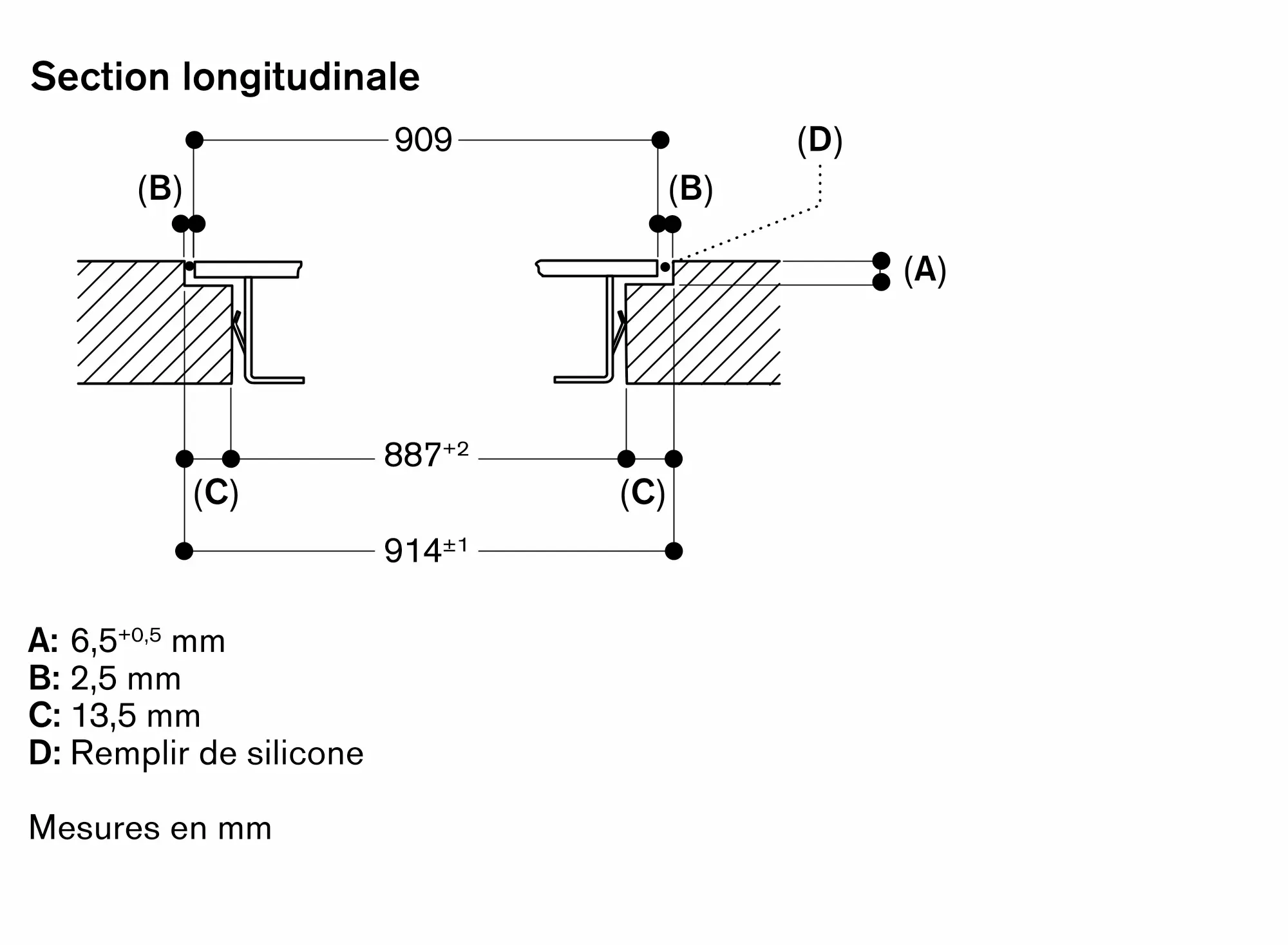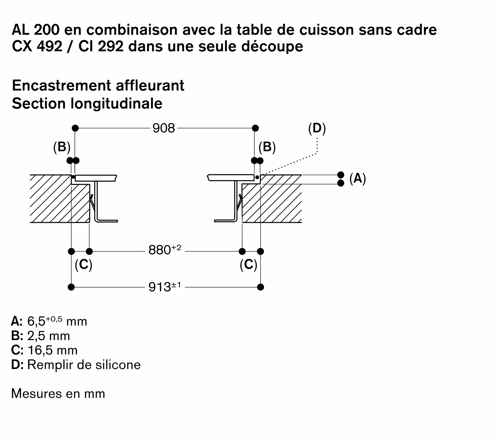 Epaisseur du plan de travail recommandée pour une installation à fleur de plan dans une seule découpe: 16 - 45 mm avec CX 492, 30 - 45 mm avec VI 492.