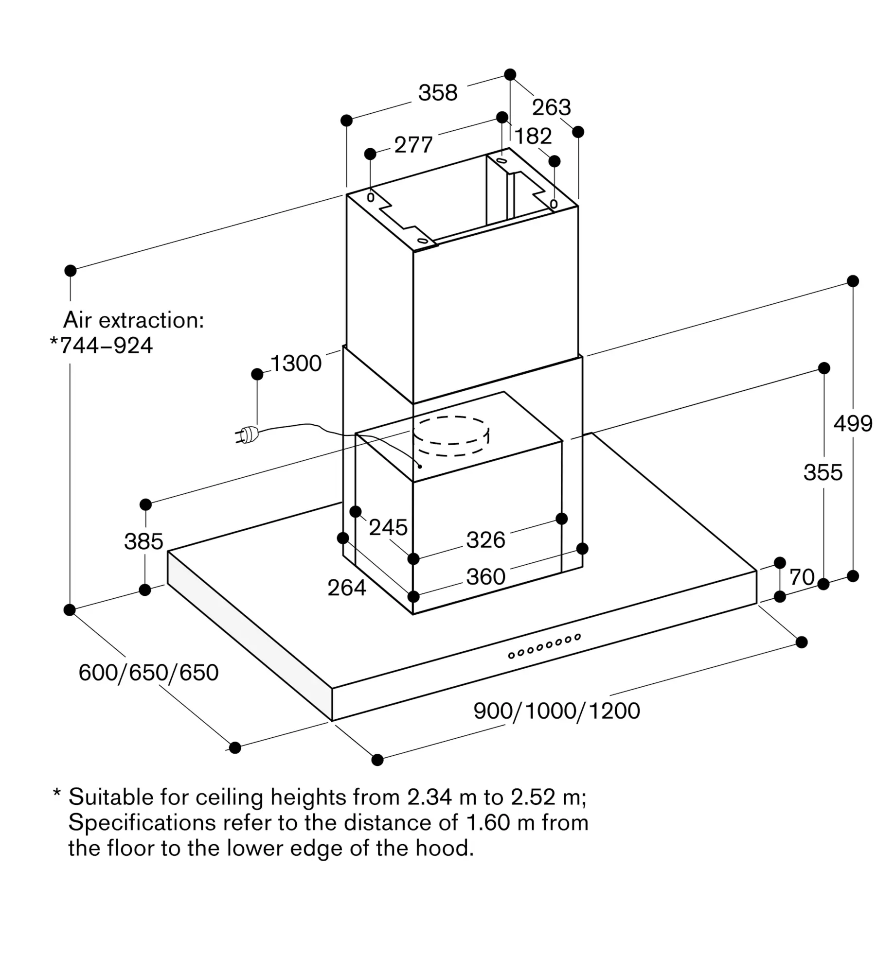 The package includes the mounting kit and the two-part chimney with the dimensions from 674 mm to 854 mm. Individual planning solutions can be implemented using the special accessory chimney extension AD200326 in combination with mounting kit extension AD223346. Special chimney types are available upon request.