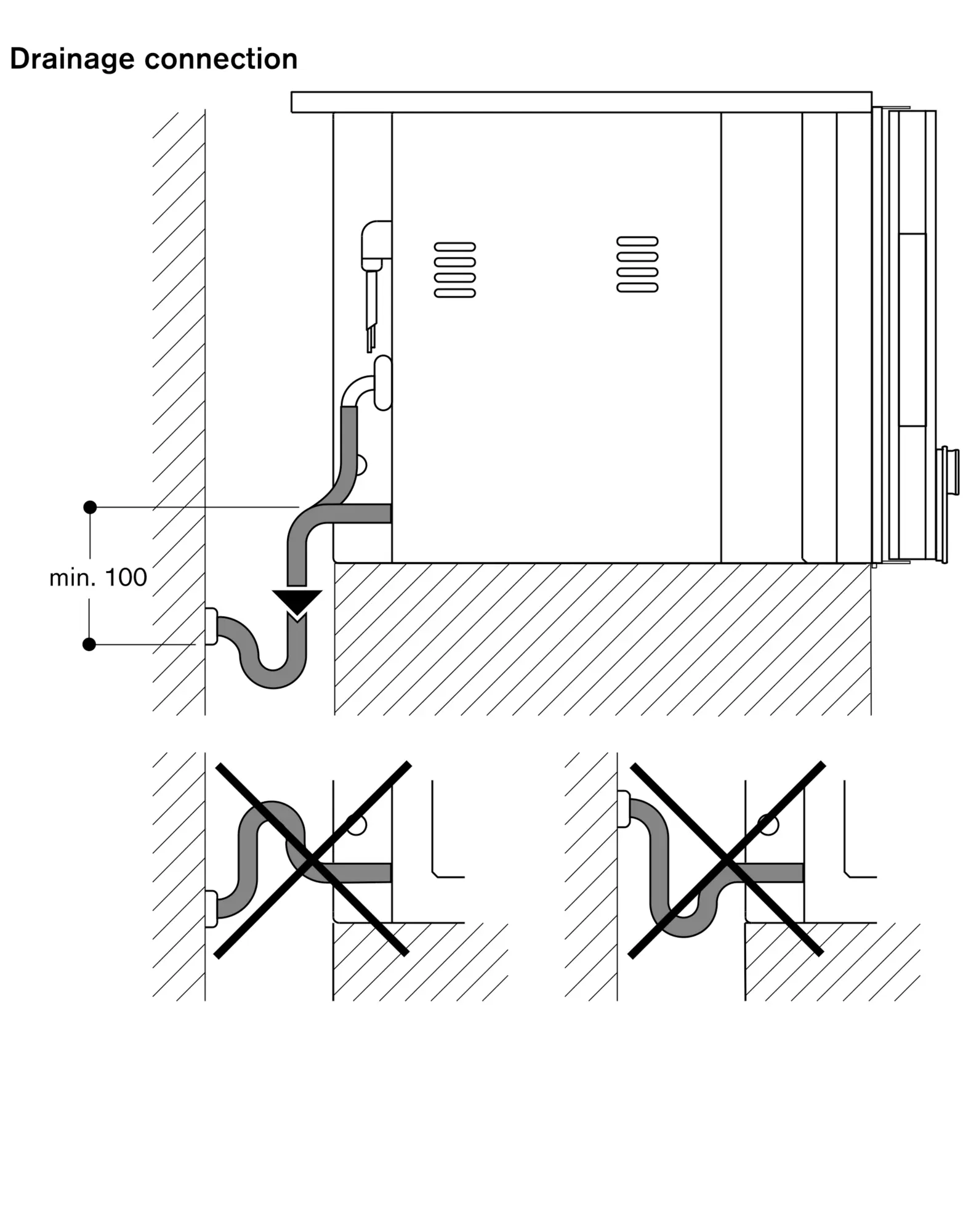 At no point may the outlet hose be positioned higher than the bottom edge of the appliance. The outlet hose must also be at least 100 mm lower than the appliance outlet (see drawing "drain connection").