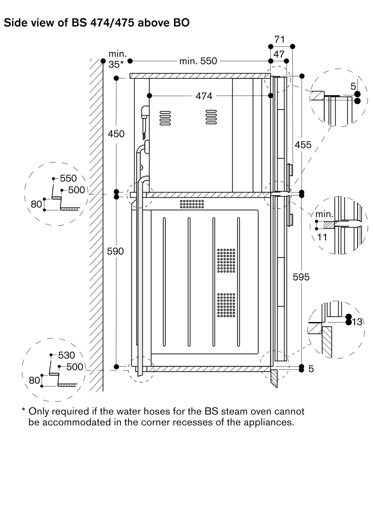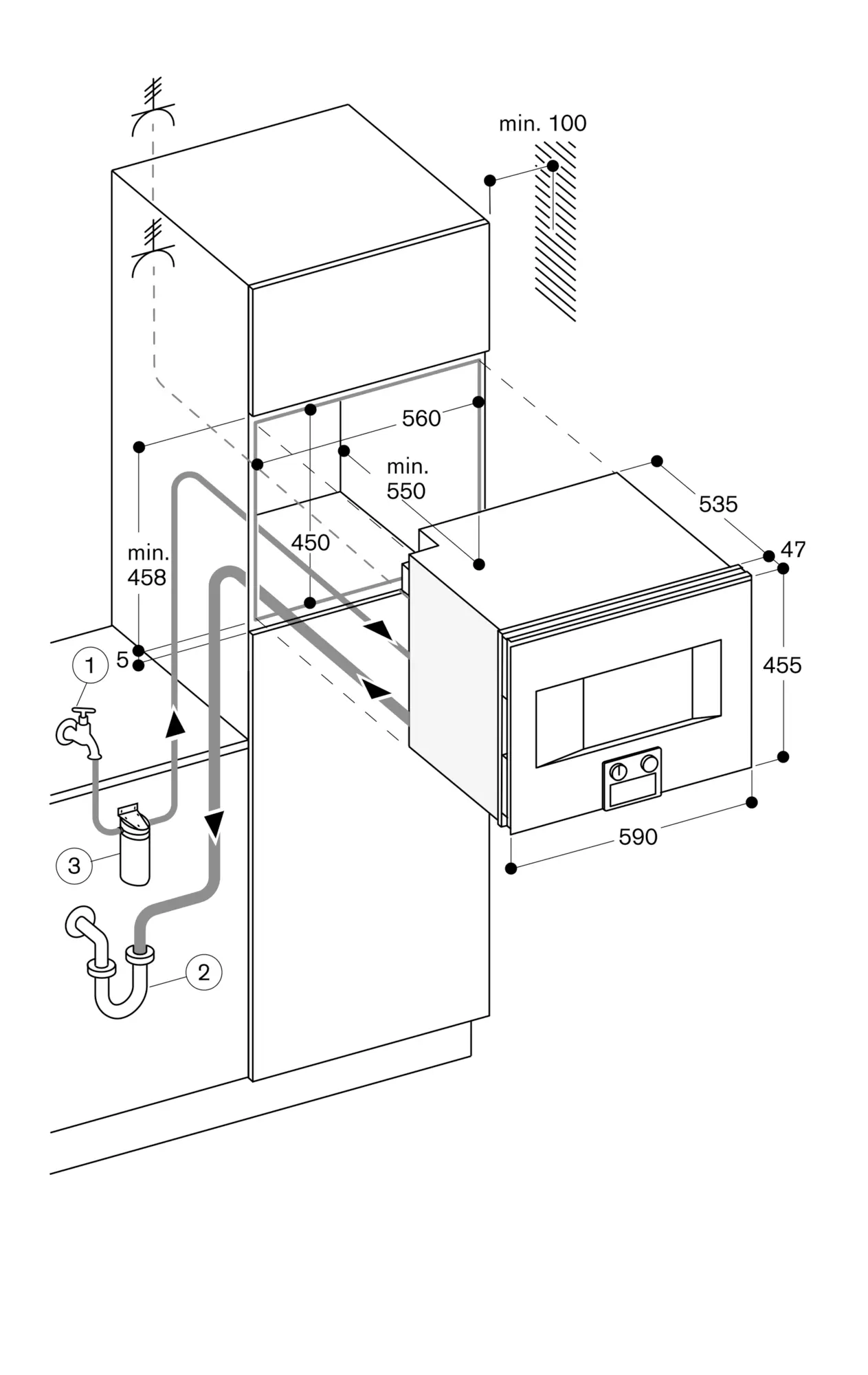 To achieve the 550 mm installation depth, the water hoses and connection cable needs to follow the slanted edge on the corner of the housing.