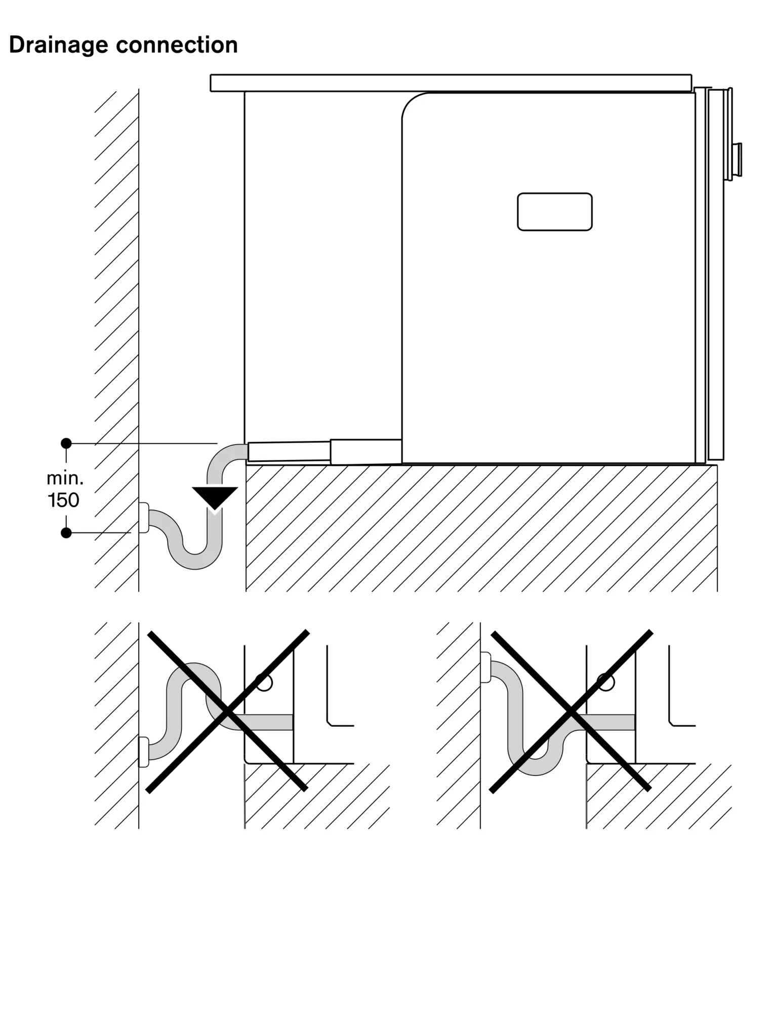 At no point may the outlet hose be positioned higher than the bottom edge of the appliance. The outlet hose must also be at least 150 mm lower than the appliance outlet (see drawing "drainage connection").