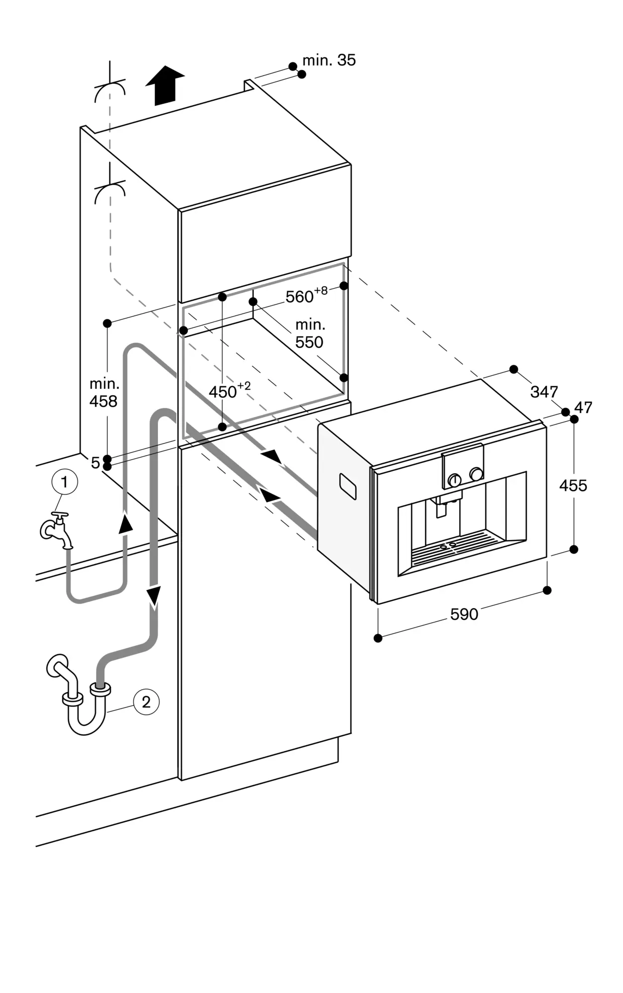 If the appliance is placed too far from the main siphon, the drain system has to be adjusted on-site (building installation).