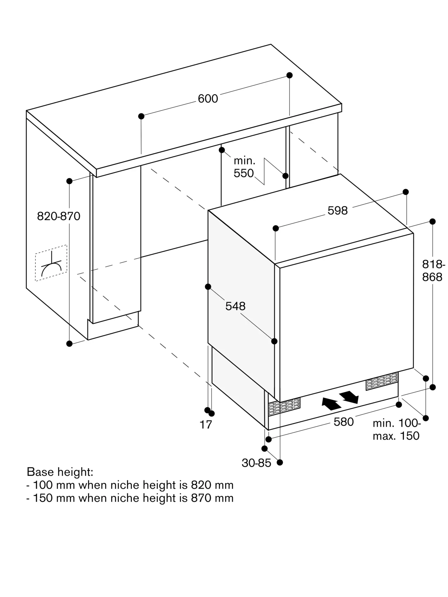 Plinth height for appliance height of 820 mm: 100 - 170 mm.