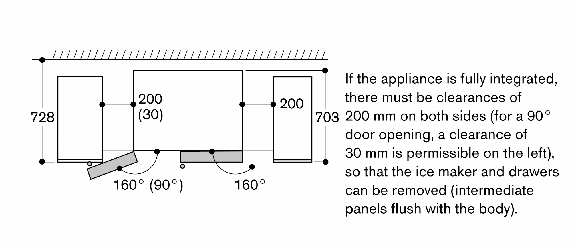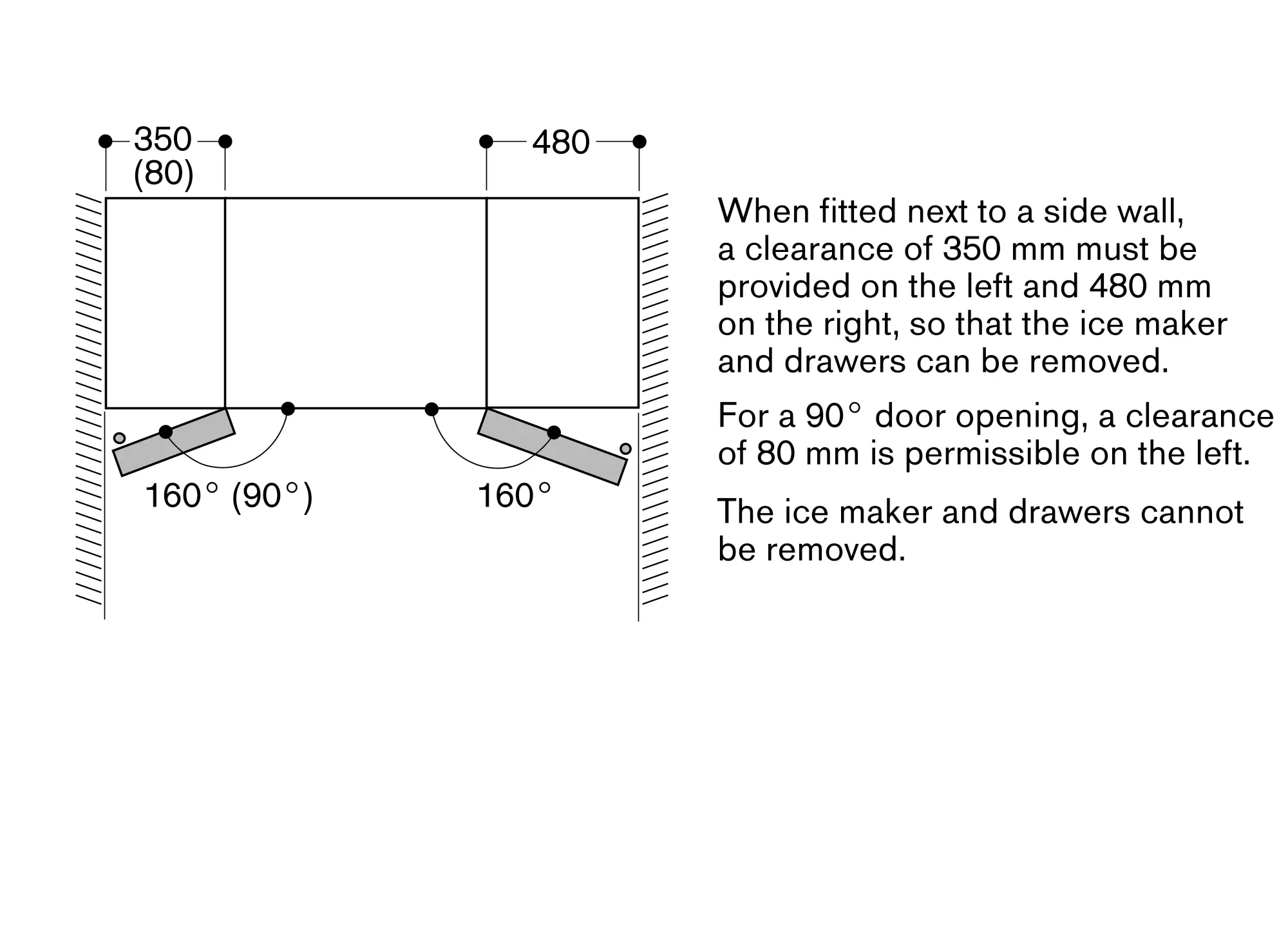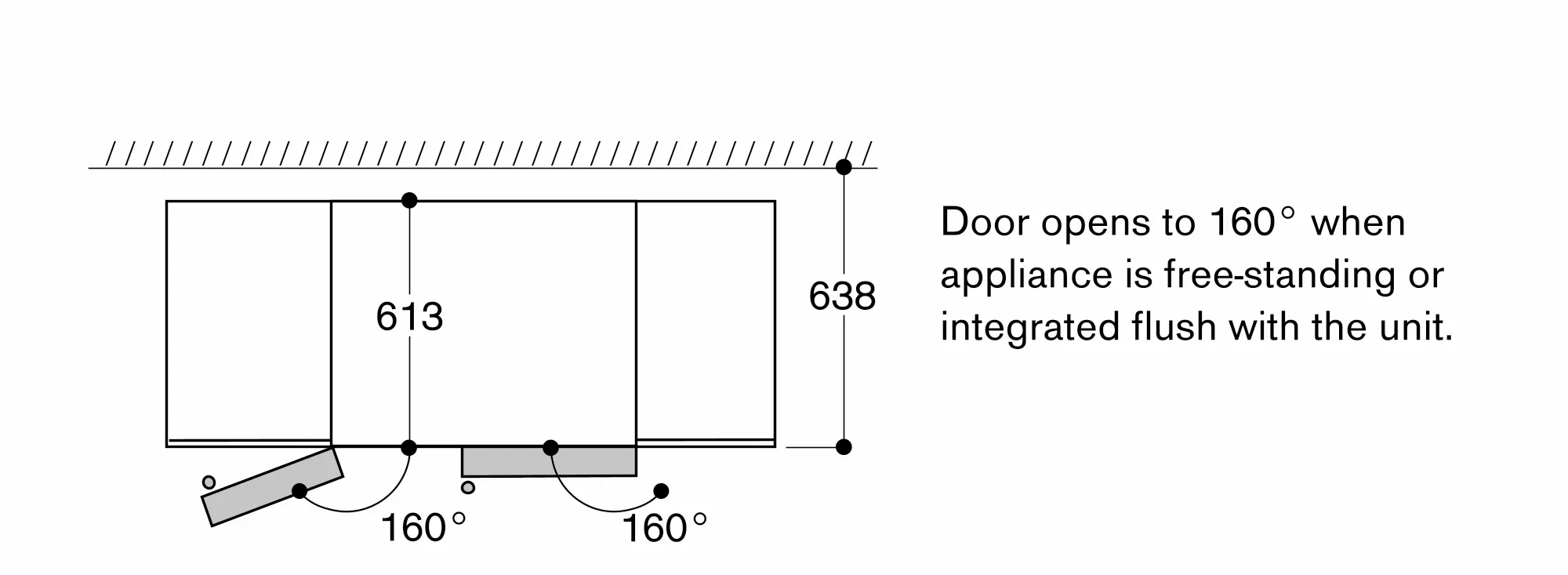 Door opening angle of 160°, left door fixable at 90°.