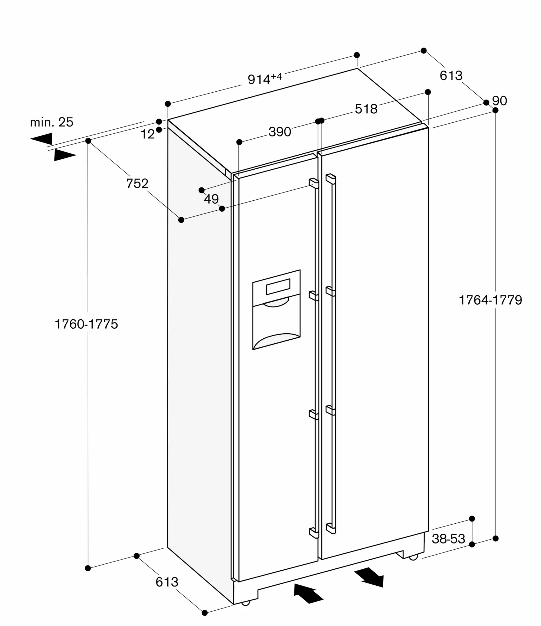Wall recess of 25 mm necessary.