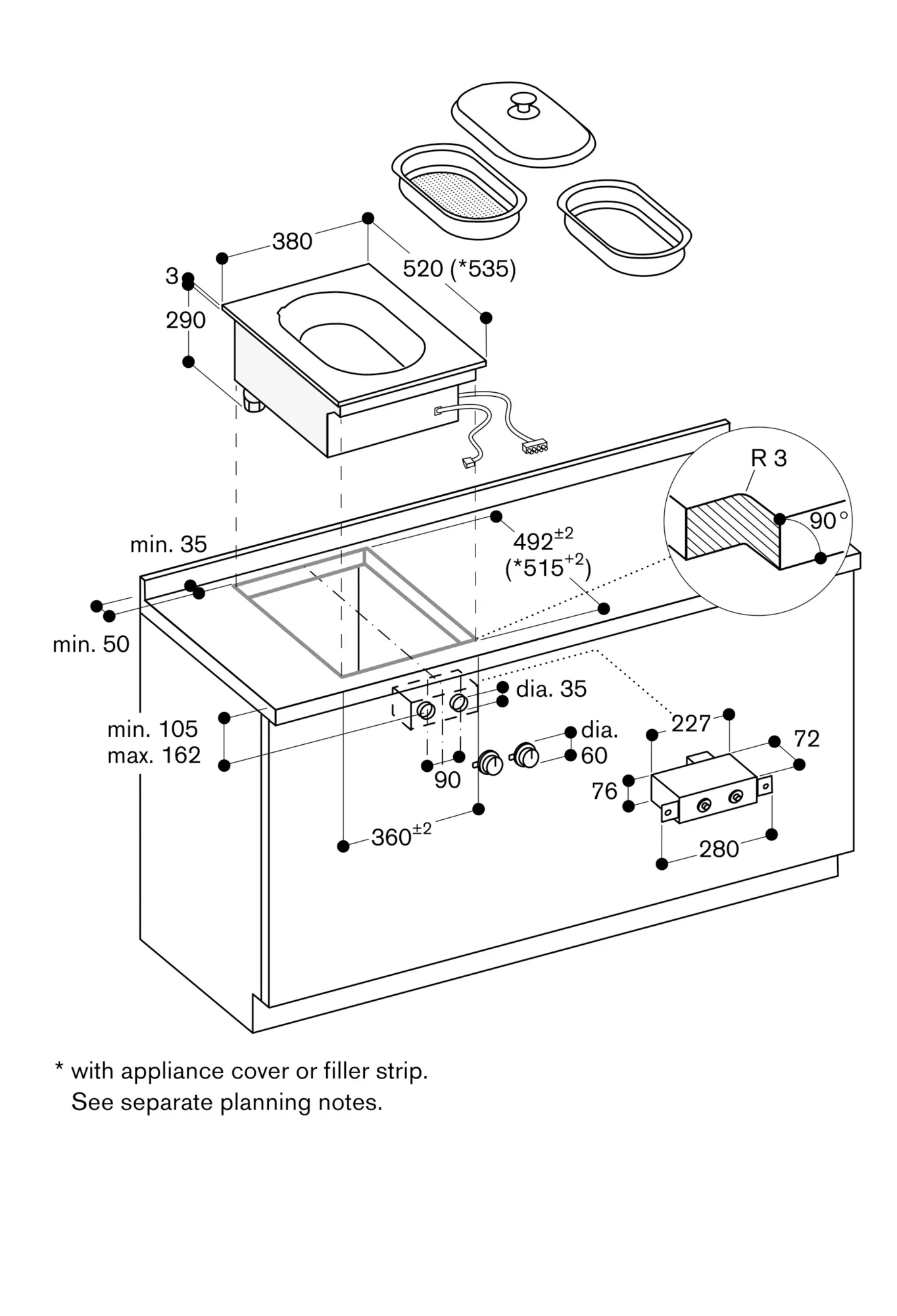 Installation is possible in worktops made of stone, synthetics or solid wood. Heat resistance and watertight sealing of the cut edges must be observed. Concerning other materials please consult the worktop manufacturer.