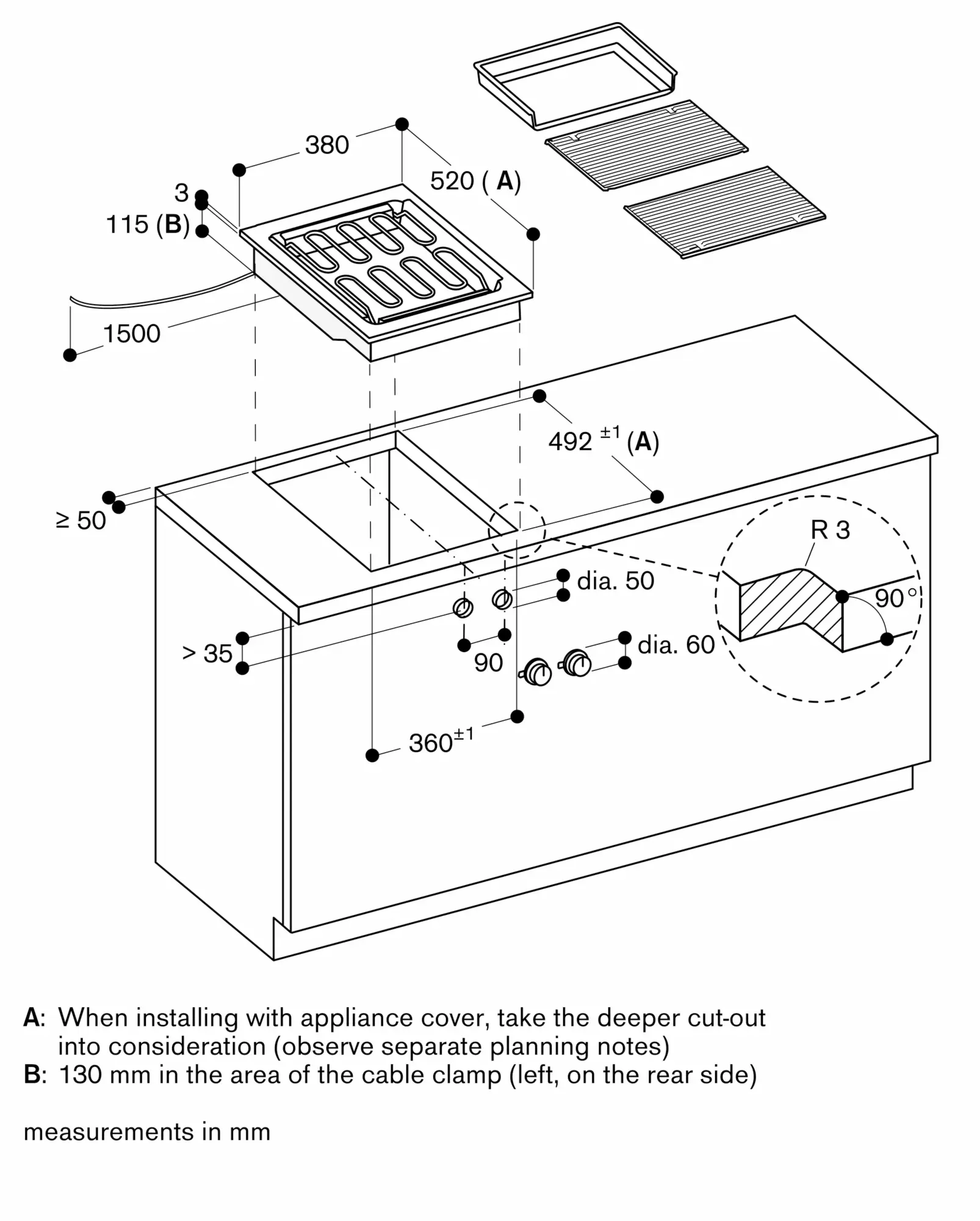 Installation is possible in worktops made of stone, synthetics or solid wood. Heat resistance and watertight sealing of the cut edges must be observed. Concerning other materials please consult the worktop manufacturer.
