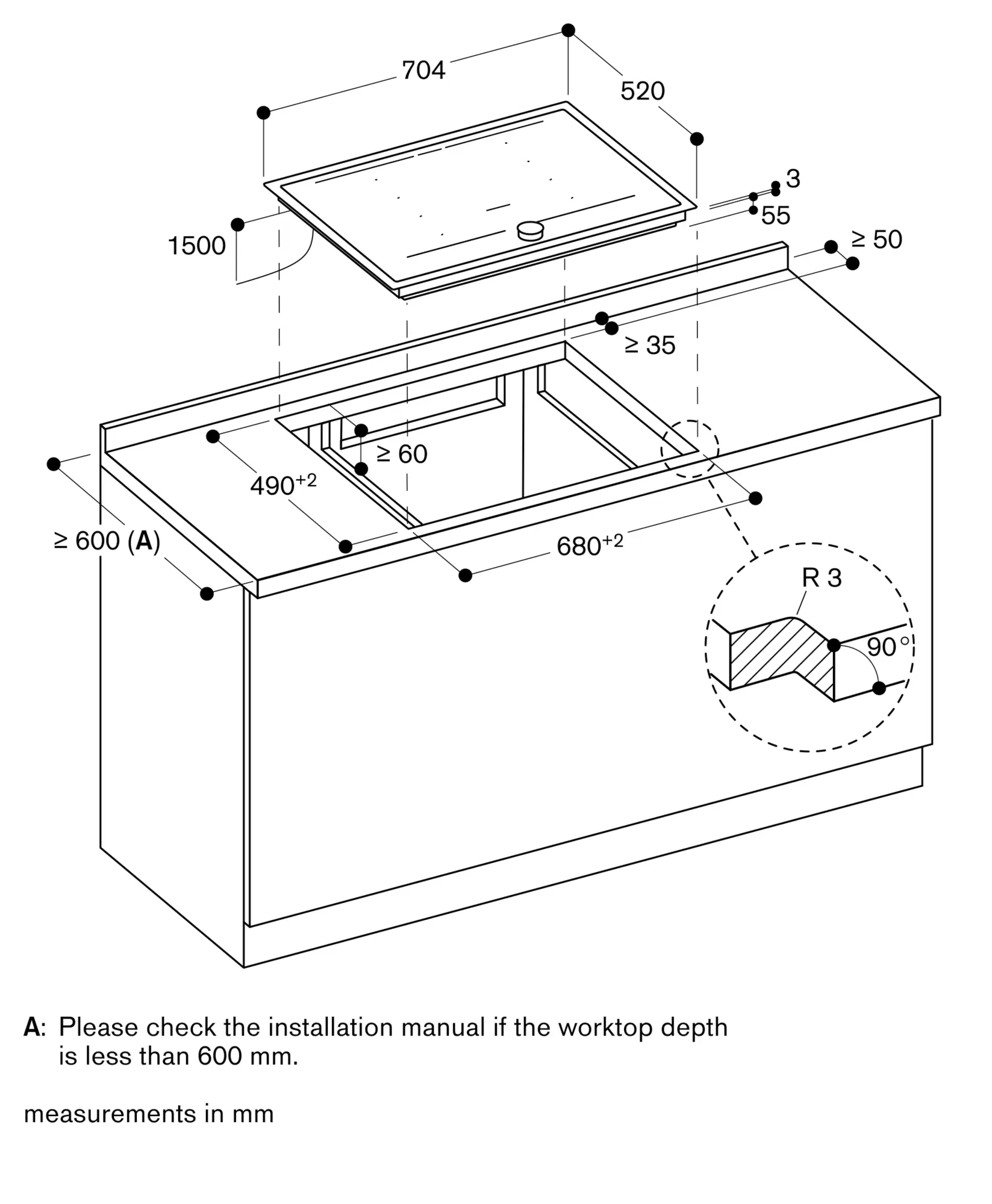 Installation is possible in worktops made of stone, synthetics or solid wood. Heat resistance and watertight sealing of the cut edges must be observed. Concerning other materials please consult the worktop manufacturer.