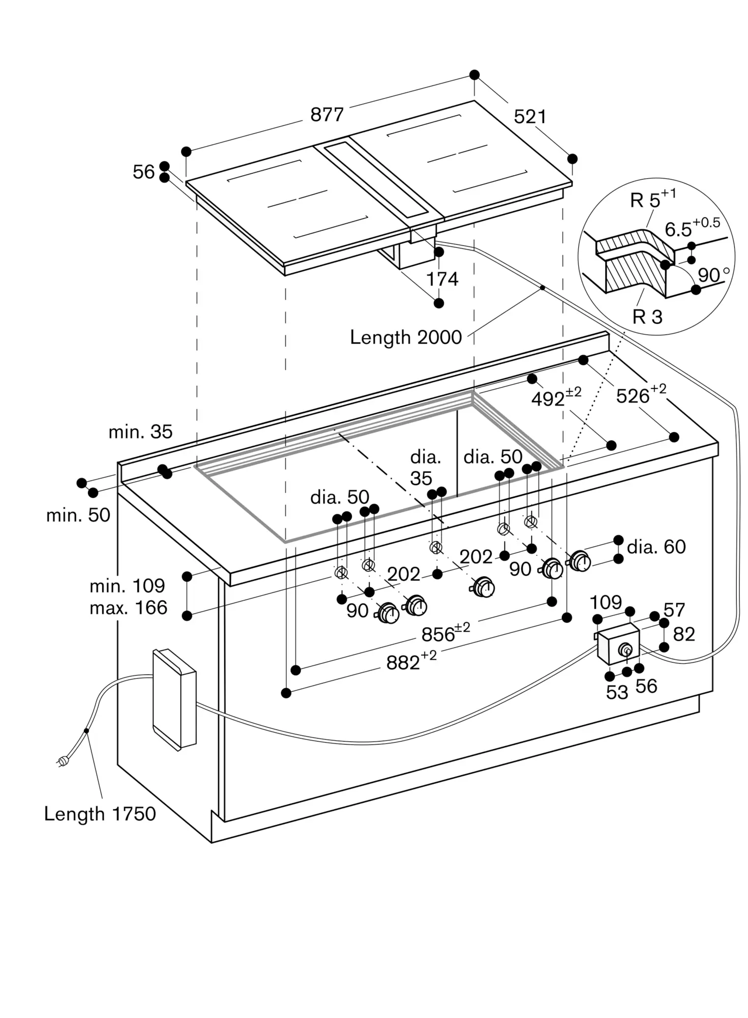 Joint width may vary due to dimensional tolerances of the glass ceramic cooktop and the worktop cut-out.