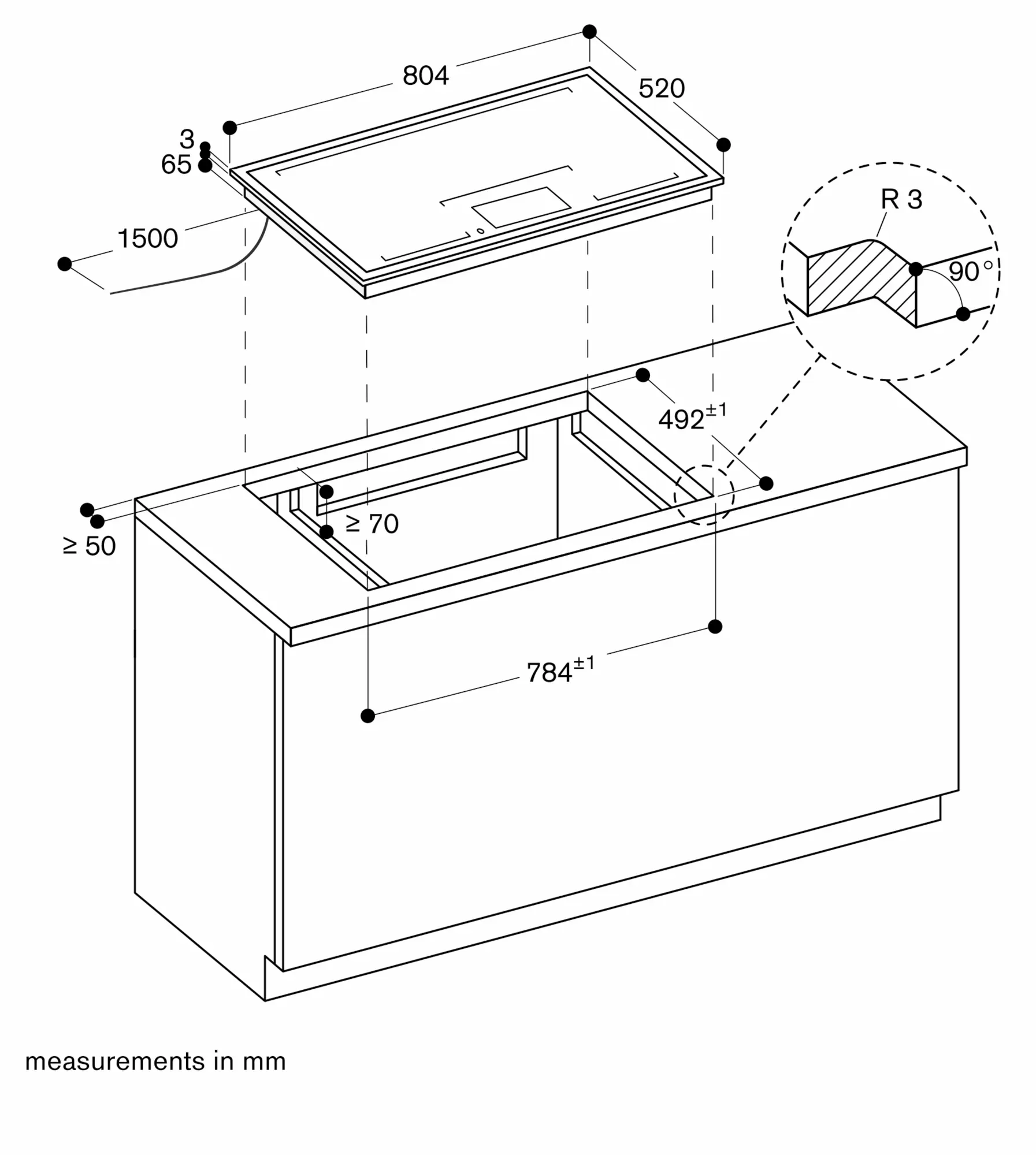 Installation is possible in worktops made of stone, synthetics or solid wood. Heat resistance and watertight sealing of the cut edges must be observed. Concerning other materials please consult the worktop manufacturer.