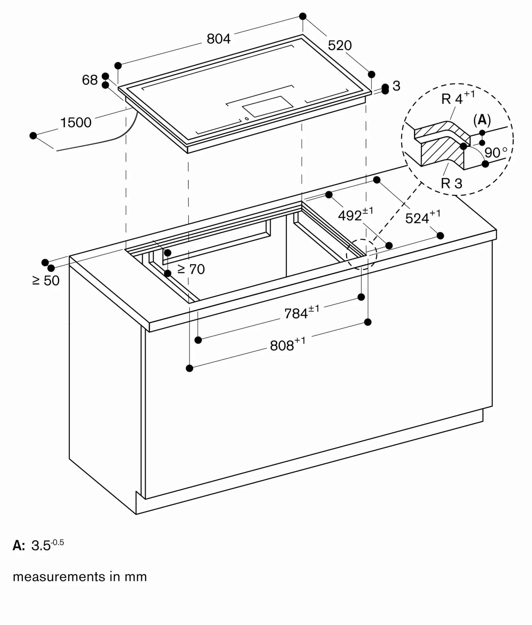 The joint width may vary due to size tolerances of the combinations and of the worktop cut-out.