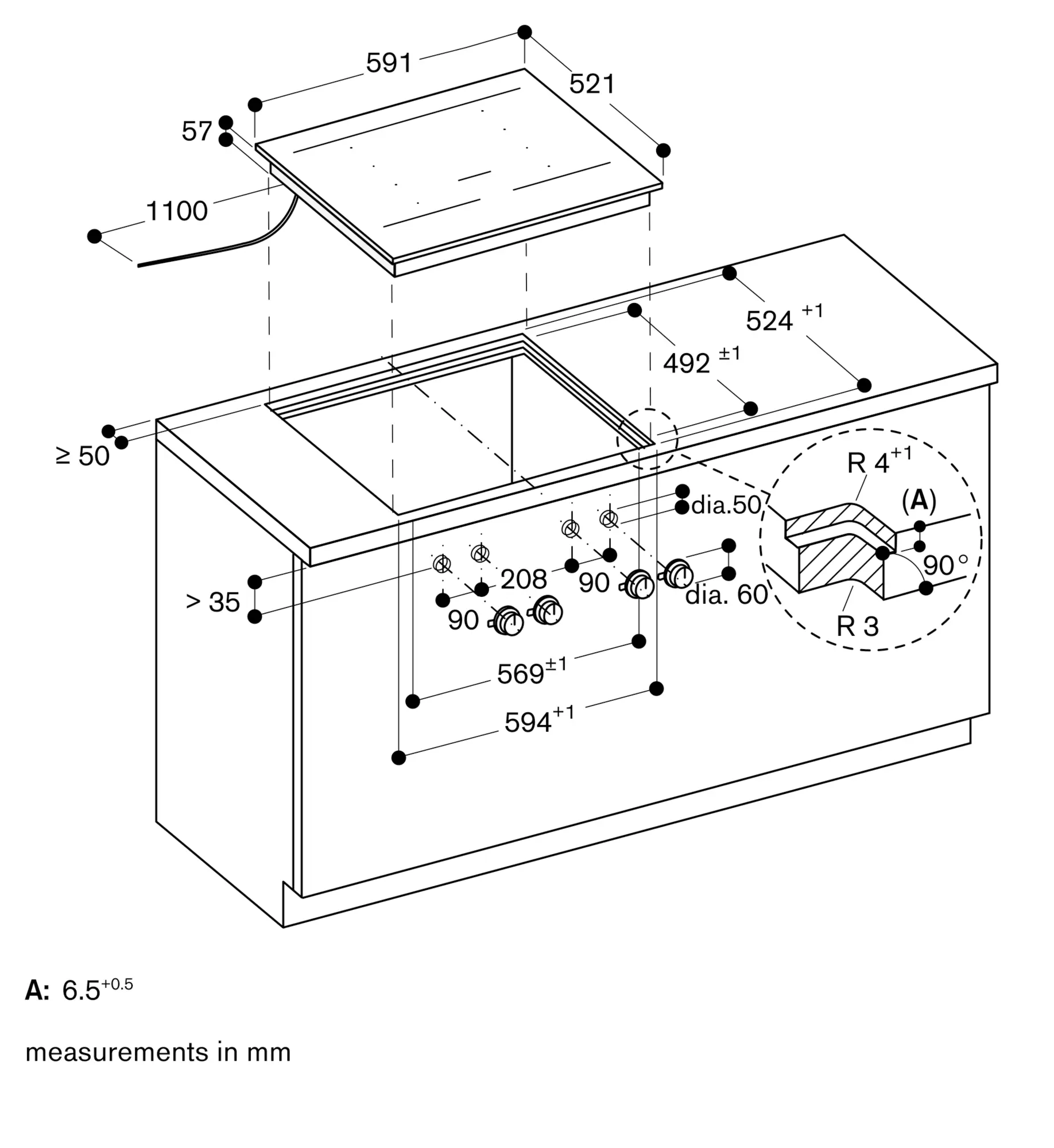 Installation is possible in worktops made of stone, synthetics or solid wood. Heat resistance and watertight sealing of the cut edges must be observed. Concerning other materials please consult the worktop manufacturer.
