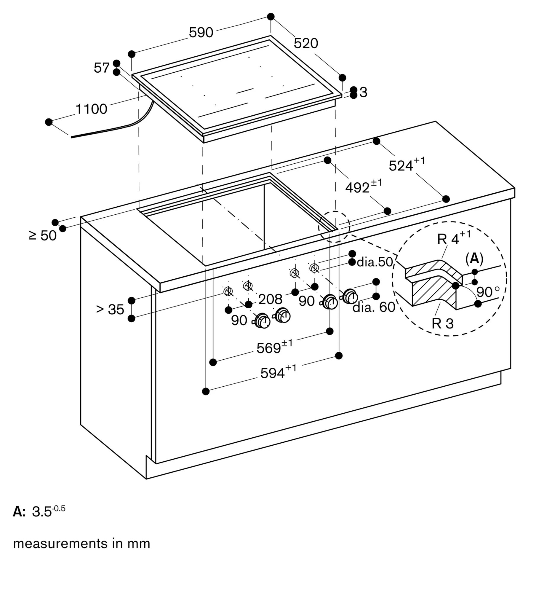 Installation is possible in worktops made of stone, synthetics or solid wood. Heat resistance and watertight sealing of the cut edges must be observed. Concerning other materials please consult the worktop manufacturer.