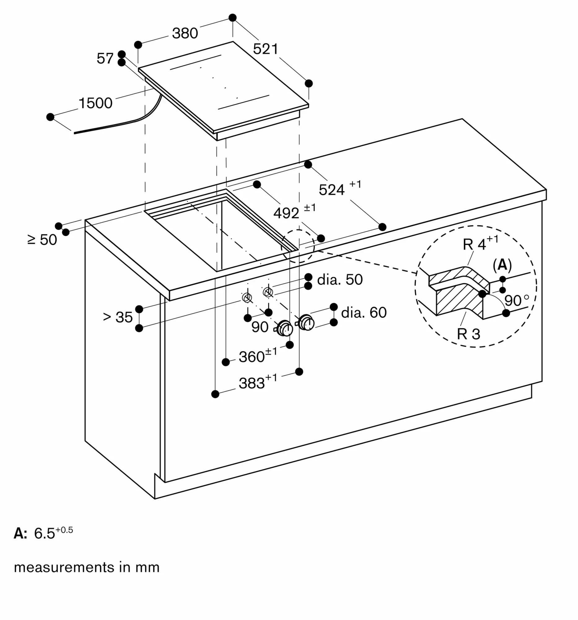Installation is possible in worktops made of stone, synthetics or solid wood. Heat resistance and watertight sealing of the cut edges must be observed. Concerning other materials please consult the worktop manufacturer.