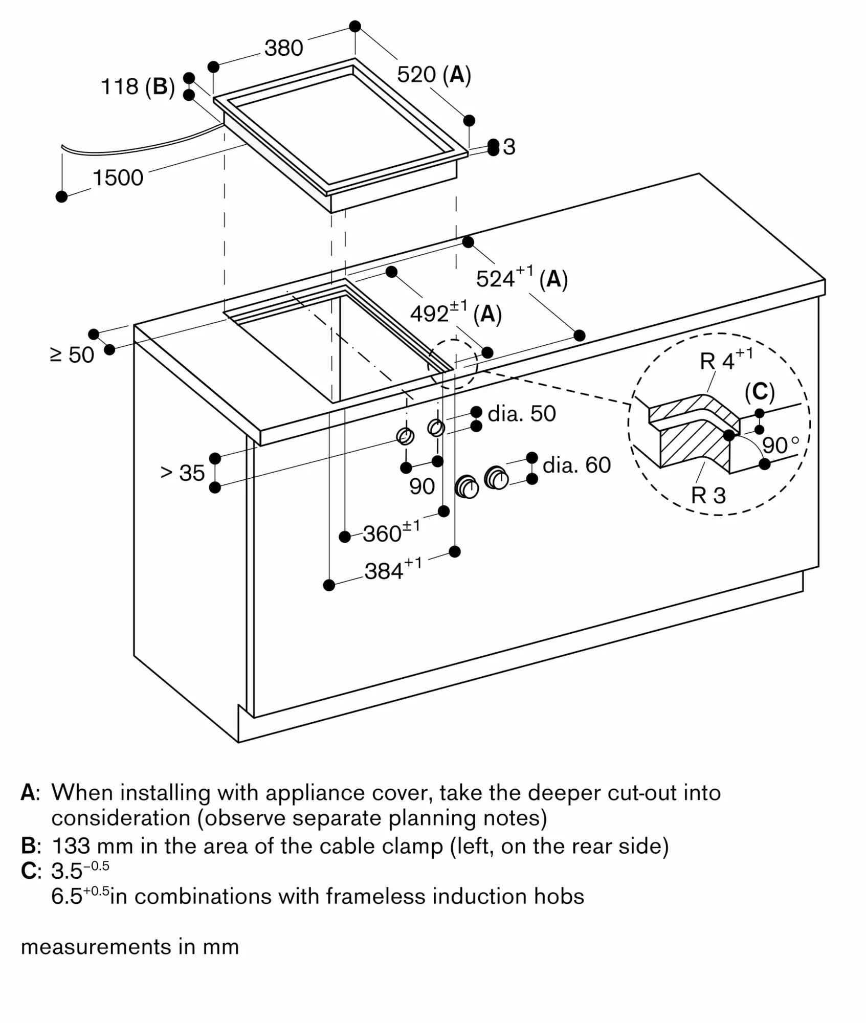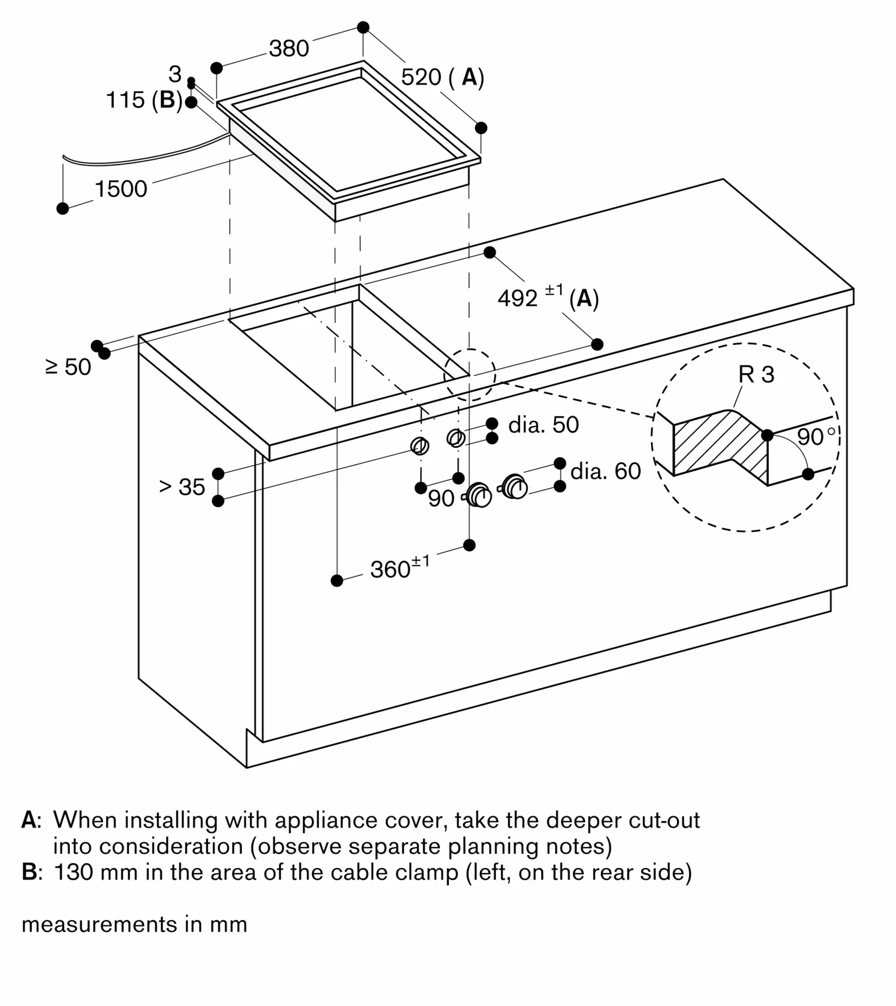 Installation is possible in worktops made of stone, synthetics or solid wood. Heat resistance and watertight sealing of the cut edges must be observed. Concerning other materials please consult the worktop manufacturer.