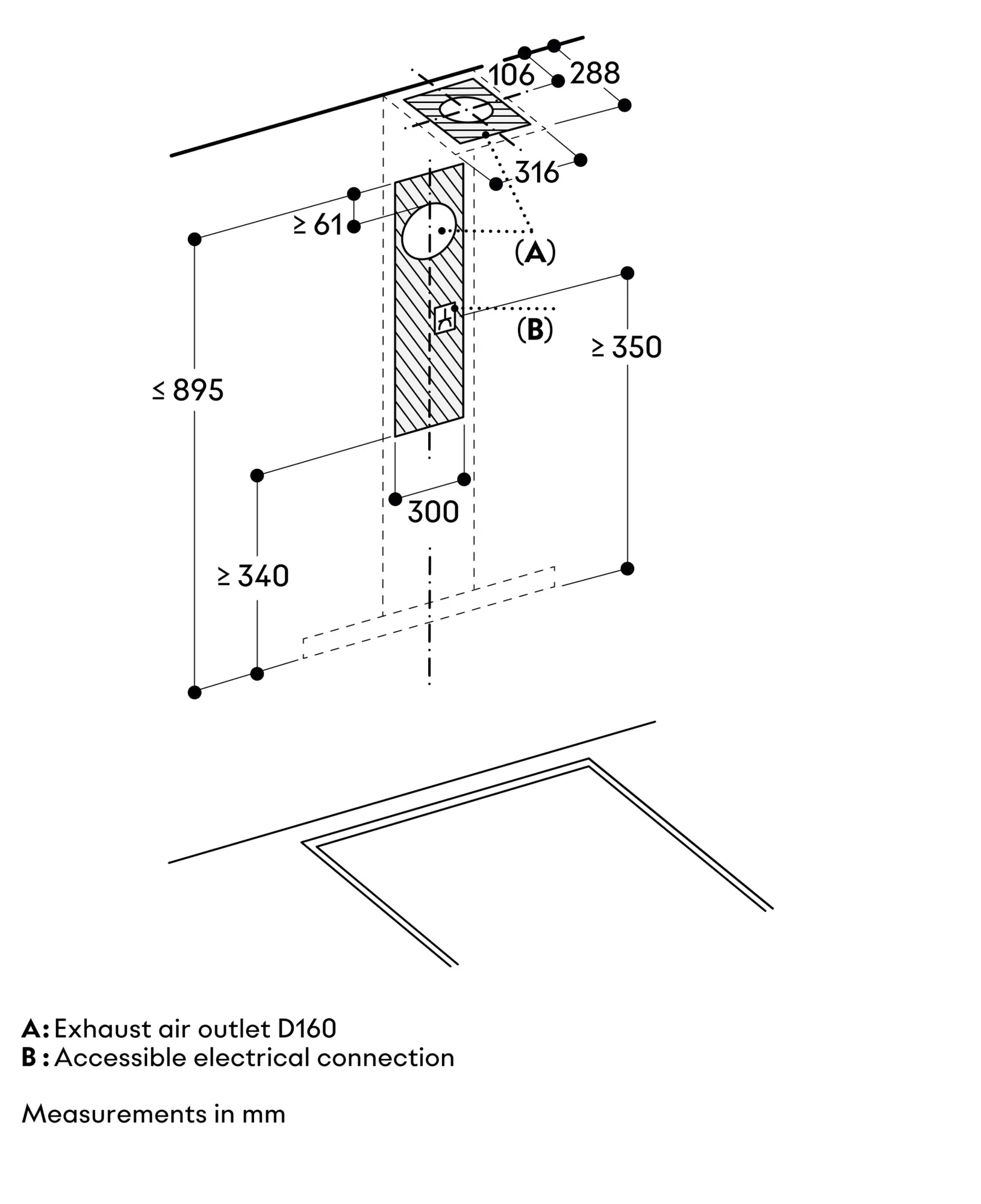 Clearance above electric appliances min. 55 cm.