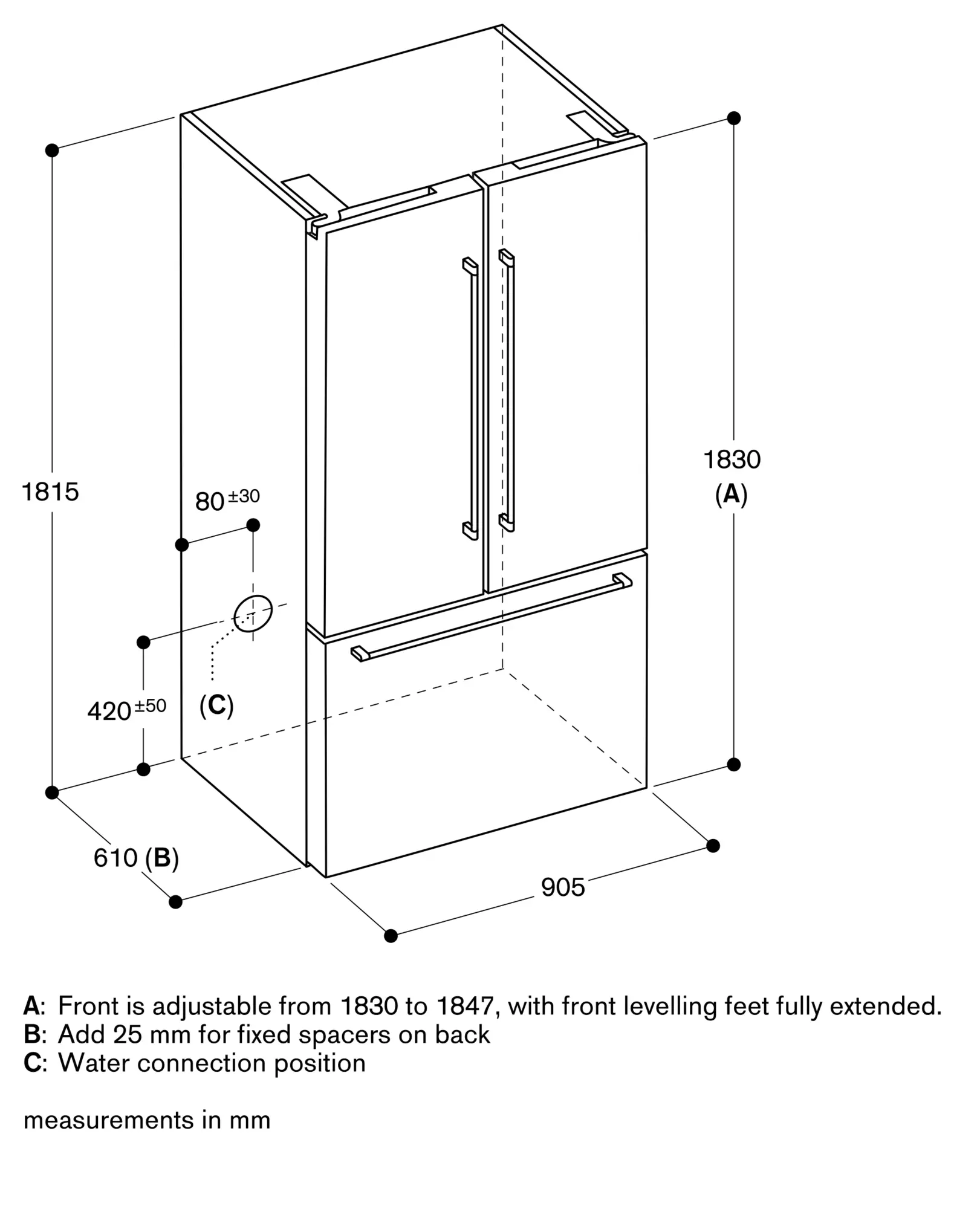 ¹ To achieve the declared energy consumption, the attached spacers have to be used. The spacers increase the appliance depth by about 2.5 cm. Without the spacers, the appliance is fully functional but consumes slightly more energy.