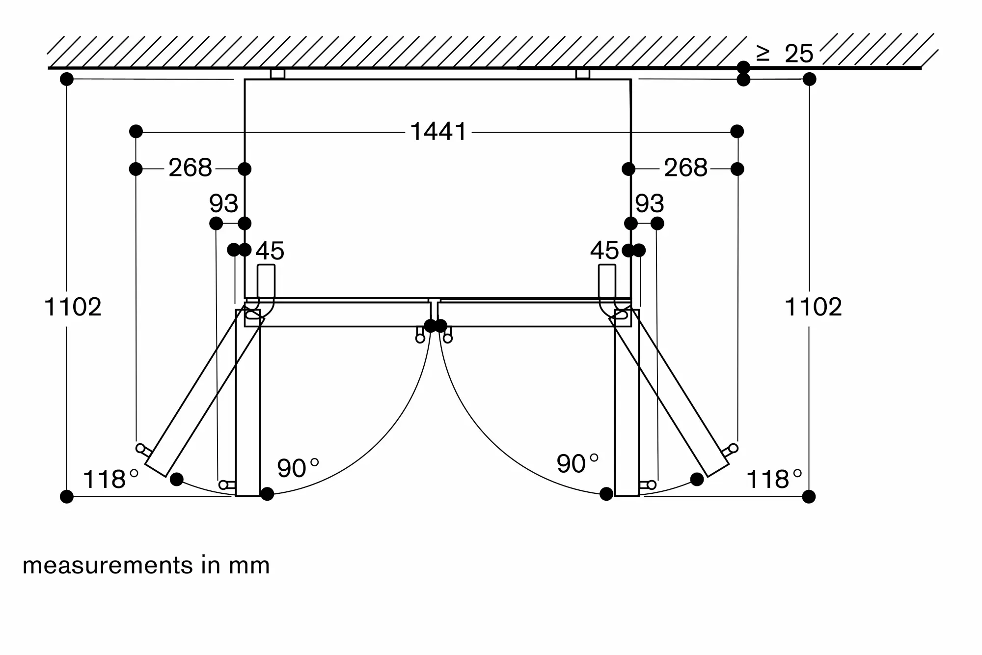 Door opening angle of 118°, fixable at 90°.