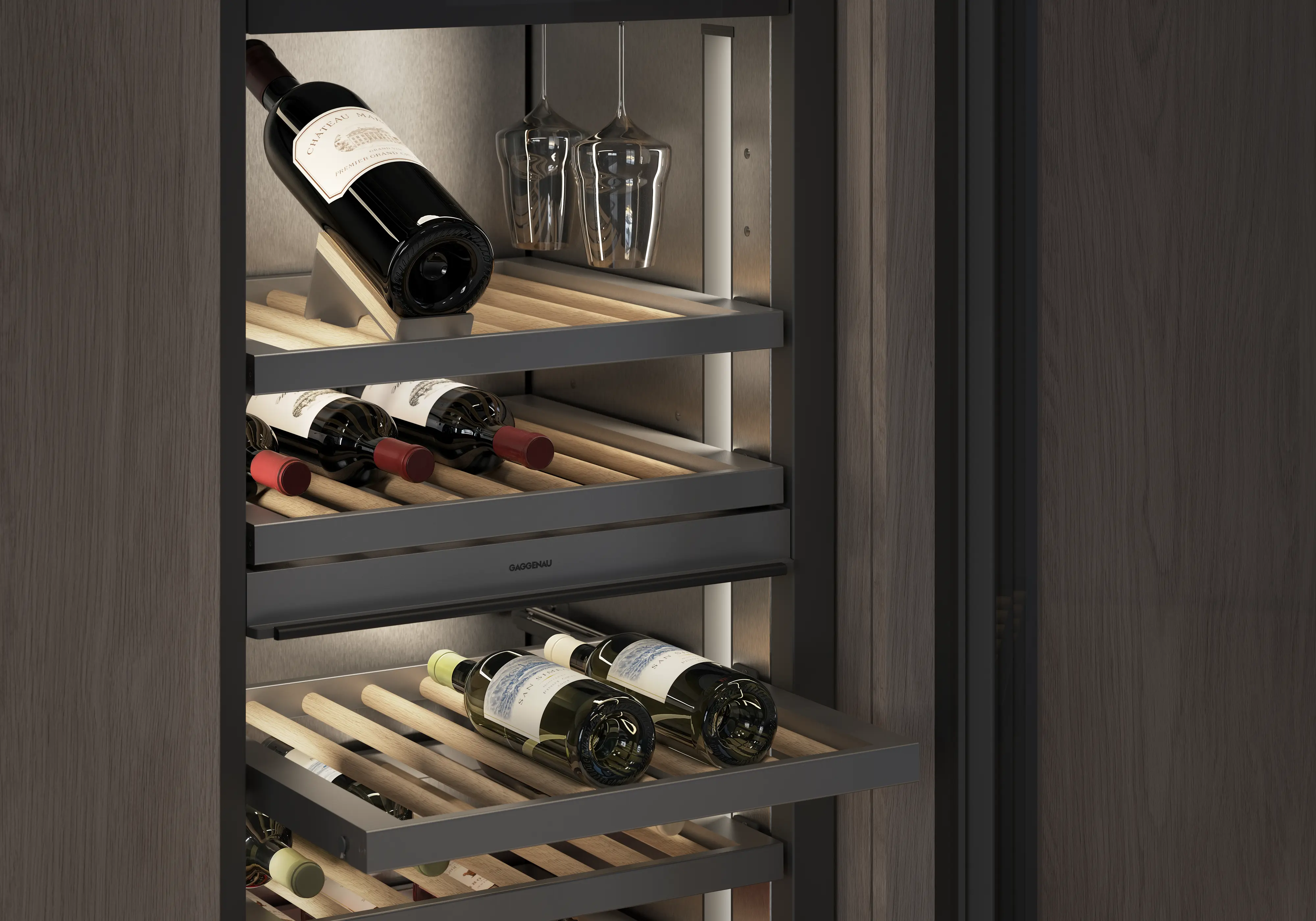 Fully extendable bottle trays with hidden telescopic rails and cushioned closing system.