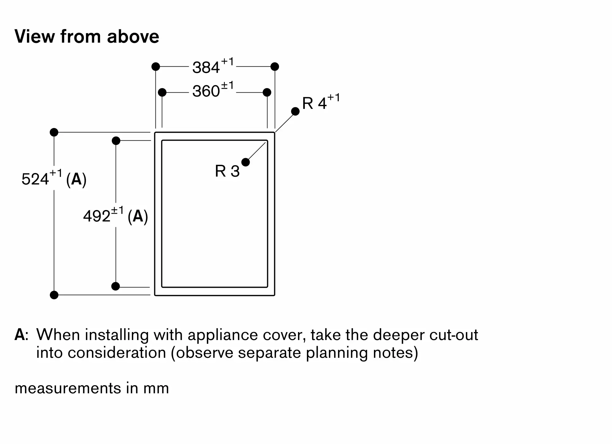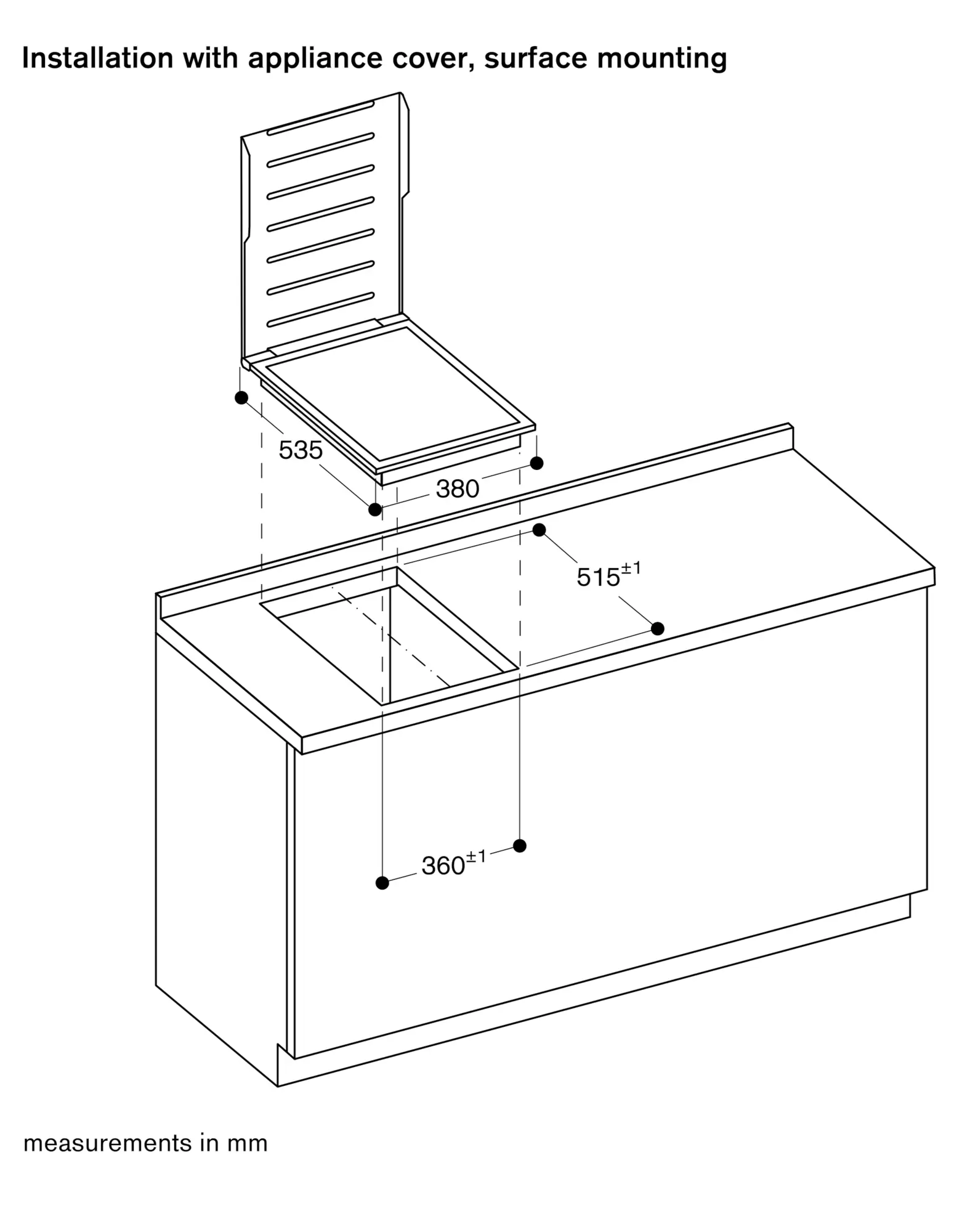 The bearing capacity and stability, in the case of thin worktops in particular, must be supported using suitable substructures. Take into account the appliance weight and additional loads.